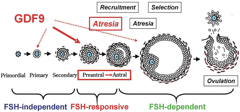 Figure 1.A representative diagram to show the action of FSH and GDF9 on follicular development and atresia in a stage-dependent manner of follicular development. Growth of the follicle can be classified into distinct stages, each of which is influenced by a different subset of factors. From primordial to secondary follicle development FSH may be not needed. At this stage the follicular development may be termed gonadotropin-independent. Transition of the follicle from the preantral to early antral stage is primarily controlled by intraovarian regulators such as GDF9, the gonadotropin at this stage may be not required, termed as gonadotropin-responsive. The continual growth past antrum formation to the preovulatory stage may be FSH-dependent. (Reproduced with permission from (4)).