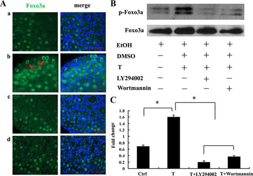Figure 2.Testosterone regulated localization and phosphorylation of Foxo3a. A, Testosterone rapidly and transiently promoted Foxo3a export from oocyte nuclei. a and b, Ovaries were untreated or stimulated with testosterone (T) (105 M) for 30 min; c and d, pretreated with or without LY294002 (25 M) or wortmannin (50 nM) for 1 h and then stimulated with T (105 M) for 30min. The ovaries were then fixed and probed with Foxo3a antibody (green) and Hoechst33342 (blue). Arrows indicate the Foxo3a localization in the region of oocyte cytoplasm. B, The cell lysates were analyzed by Western blot using antibodies to phospho-Foxo3a or Foxo3. C, The bar graph represents the results of densitometric analysis. The statistical evaluation of the data were from three independent experiments. *, P <0.0.5. (Repruduced with permission from (1)).