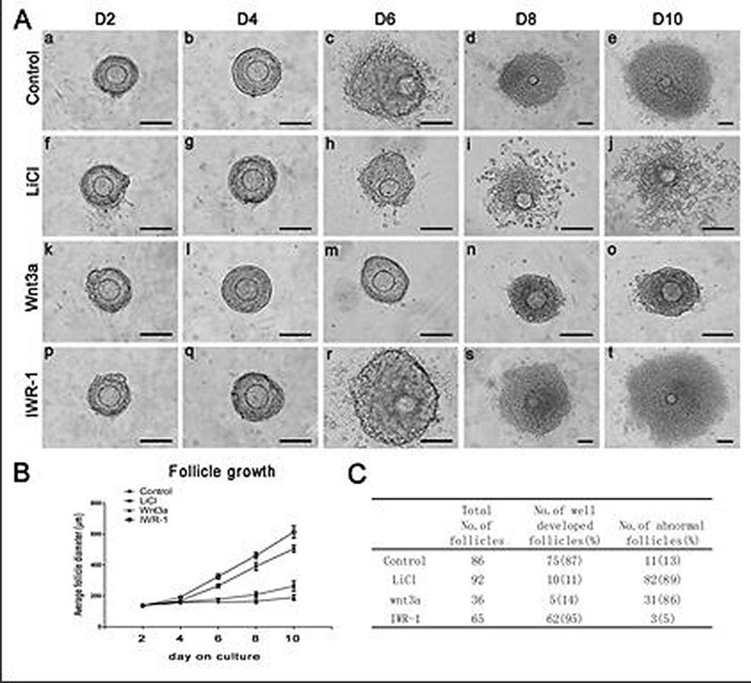 Figure 3.Follicle growth, diameter and survival treated by LiCl, Wnt3a or IWR-1. A,Morphological observation of follicle growth over 10 days of culture. The up panel represents the control follicle on day 2 (a), day 4 (b), day 6 (c), day 8 (d) and day 10 (e) of culture. The second panel represents the LiCl (15mM) treated follicle on day 2 (f), day 4 (g), day 6 (h) , day 8 (i) and day 10 (j) of culture. The third panel represents the Wnt3a (100ng/ml) treated follicle on day 2 (k), day 4 (l), day 6 (m) , day 8 (n) and day 10 (o) of culture. The low panel represents the IWR-1 (10μM) treated follicle on day 2 (p), day 4 (q), day 6 (r), day 8 (s) and day 10 (t) of culture. Scale bar, 100μm. B,LiCl, Wnt3a and IWR-1effected on diameters of cultured follicles. Data are presented as the mean±S.E.M. The statistical evaluation of the data was from three independent experiments. C, Numbers of total cultured follicles, follicles of well developed and abnormal follicles from different treatment were counted. Percentage of each pattern was shown in parentheses (Reproduced with permission from reference (22)).