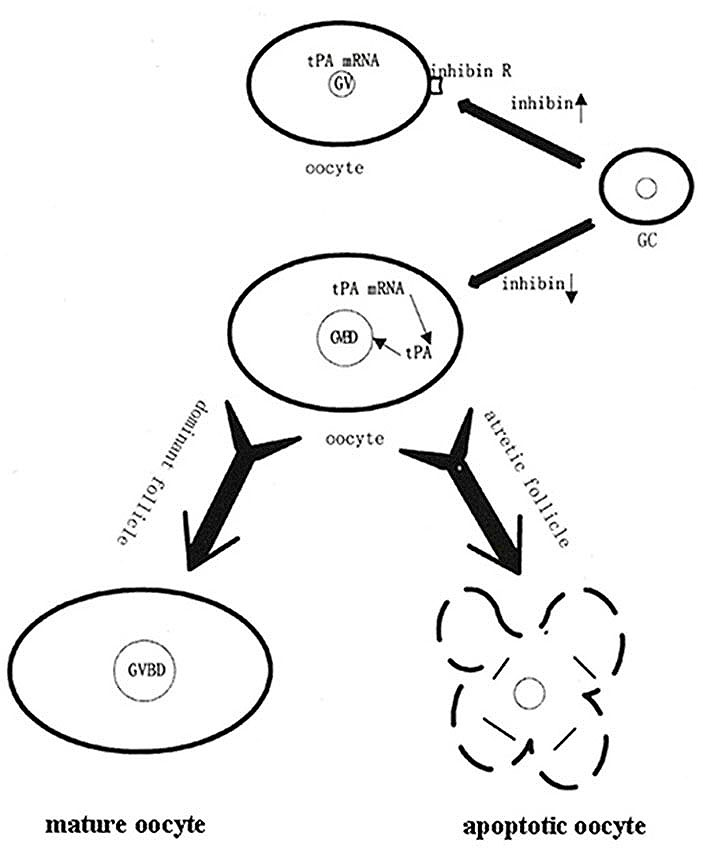 Figure 4.Effect of inhibin emanated from GC on tPA mRNA translation in oocyte (Reproduced with permission from (4)). Inhibin originating from the GCs inhibits the oocyte maturation by inhibiting tPA mRNA translation in the oocyte. Once inhibin expression in GCs is decreased, the oocyte tPA mRNA starts to translate into its active protein, the subsequently increased tPA activity induces the oocyte GVBD in the dominant follicle leading to the oocyte maturation and ovulation; On the other hand, decreases in GC inhibin expression in the developing follicle, the oocyte tPA mRNA is triggered to translate tPA protein which is capable of inducing its certain morphological changes similar to GVBD in the developing follicle, subsequently leading to the oocyte and/or the follicle apoptosis.