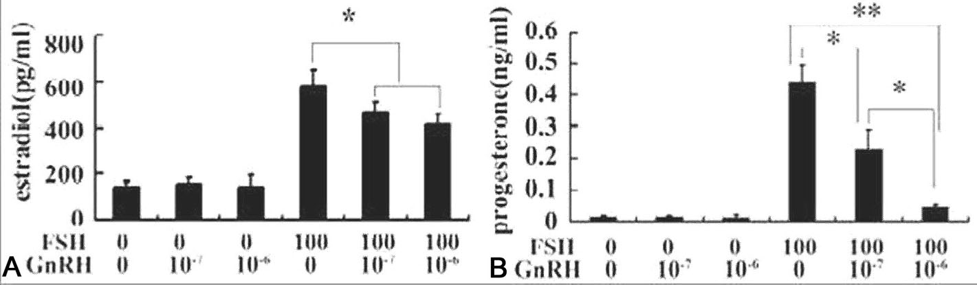 Figure 5.GnRH-III inhibited FSH-induced estrogen and progesterone production in cultured primary granulosa cells. Granulosa cells obtained from DES-primed immature rat ovaries were cultured in the serum-free McCoy’s 5a containing androstendione (10-7M) alone (control) or supplemented with 100 ng/ml FSH and/or GnRH-III (10-7M and 10-6M) for 48 hrs. The contents of estradiol (Fig 1A) and progesterone (Fig 1B) in the media were measured by standard RIA procedures. Data are presented as mean±S.E.M. (n=3). Bars with * among the groups indicated significant different. *, significant different at P<0.0.5.; **, P<0.0.1. (Reproduced with permission from (28)).