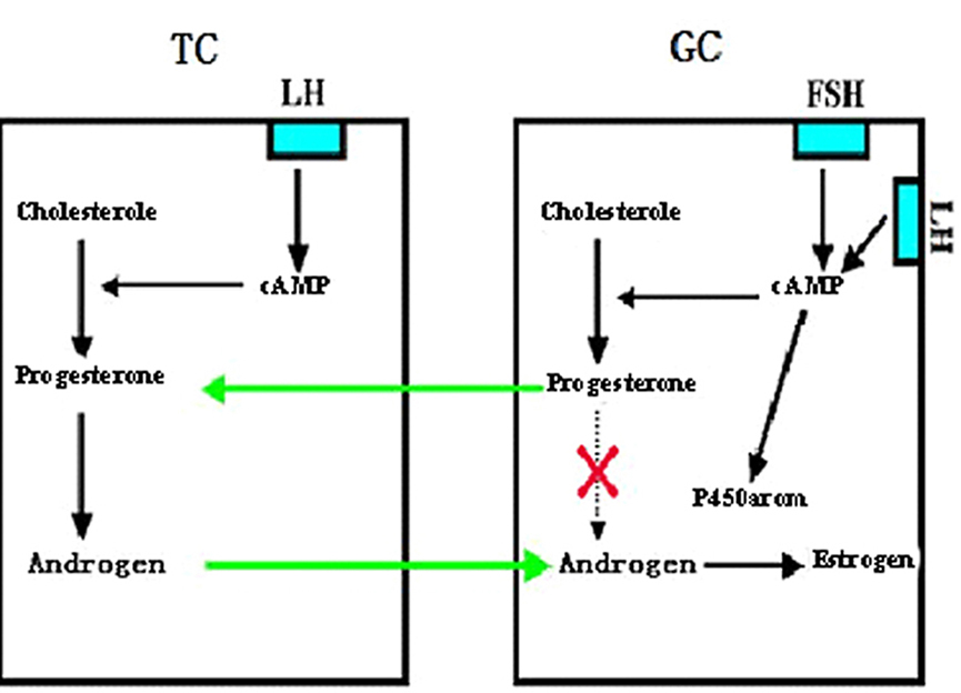 Figure 6.A representative diagram showing involvement of interaction between granulosa cell (GC) and theca cell (TC) in estrogen production in the follicle. TC synthesizes androgen under the regulation of LH, but it cannot be converted into estrogen for lack of P450arom in TC. Under the action of FSH (also by LH at the late stage) GC synthesizes progesterone, the latter, however cannot be converted further into androgen for lack of the necessary converting enzymes in GC. GC cannot synthesize estrogen by itself, although it has the P450arom. TC used progesterone produced by GC to convert androgen, while the androgen produced by TC is used by GC to convert into estrogen. The interaction of TC and GC is a prerequisite for estrogen biosynthesis in the ovary (Reproduced from with permission from (4)).