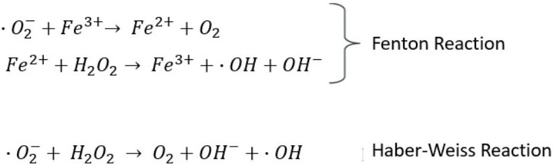 The Fenton and Haber-Weiss reactions result in the generation of a highly reactive hydroxyl radical from hydrogen peroxide and a superoxide anion. The process is catalyzed by iron.