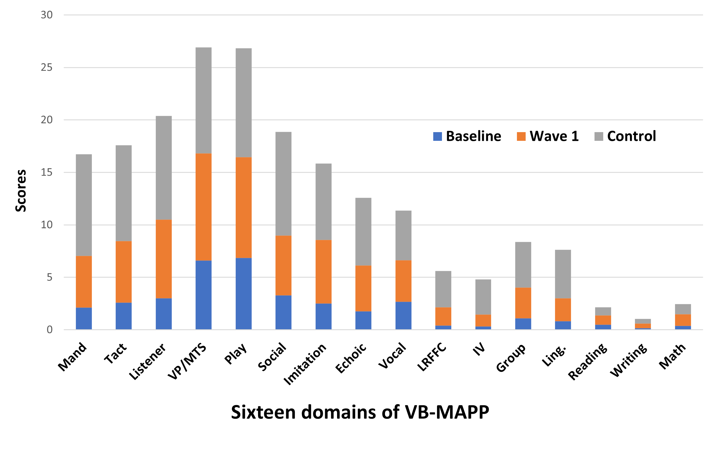 As shown in Table 3 and Fig. 1, a significant improving effect of intensive home-based behavioral intervention was found between children with ASD at baseline and children with ASD at Wave 1 in terms of total VB-MAPP score (p