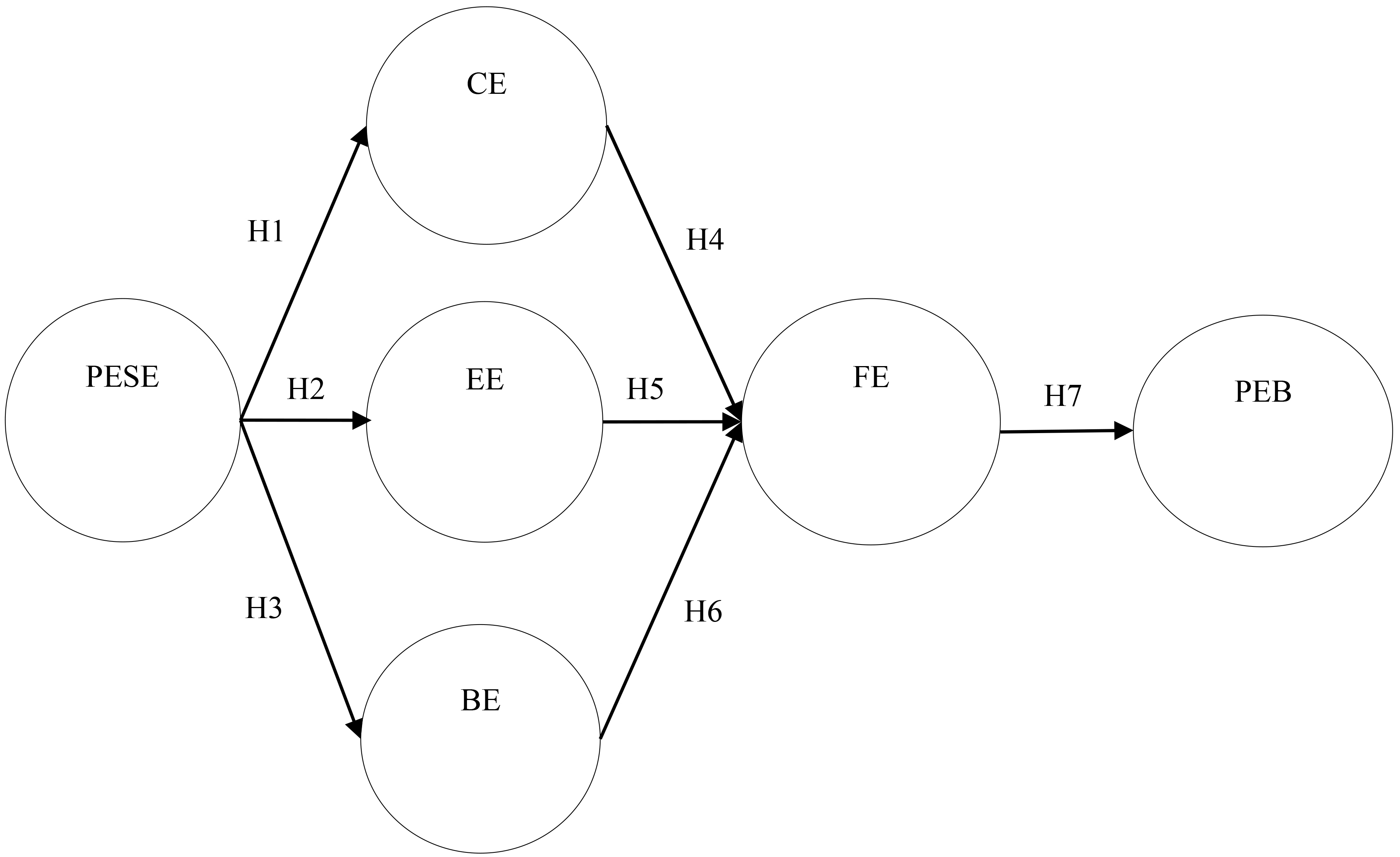 Fig. 1. Research Model. Notes: PESE, physical exercise self-efficacy; CE, cognitive engagement; EE, emotional engagement; BE, behavioral engagement; FE, fluency experience; PEB, persistent exercise behavior.