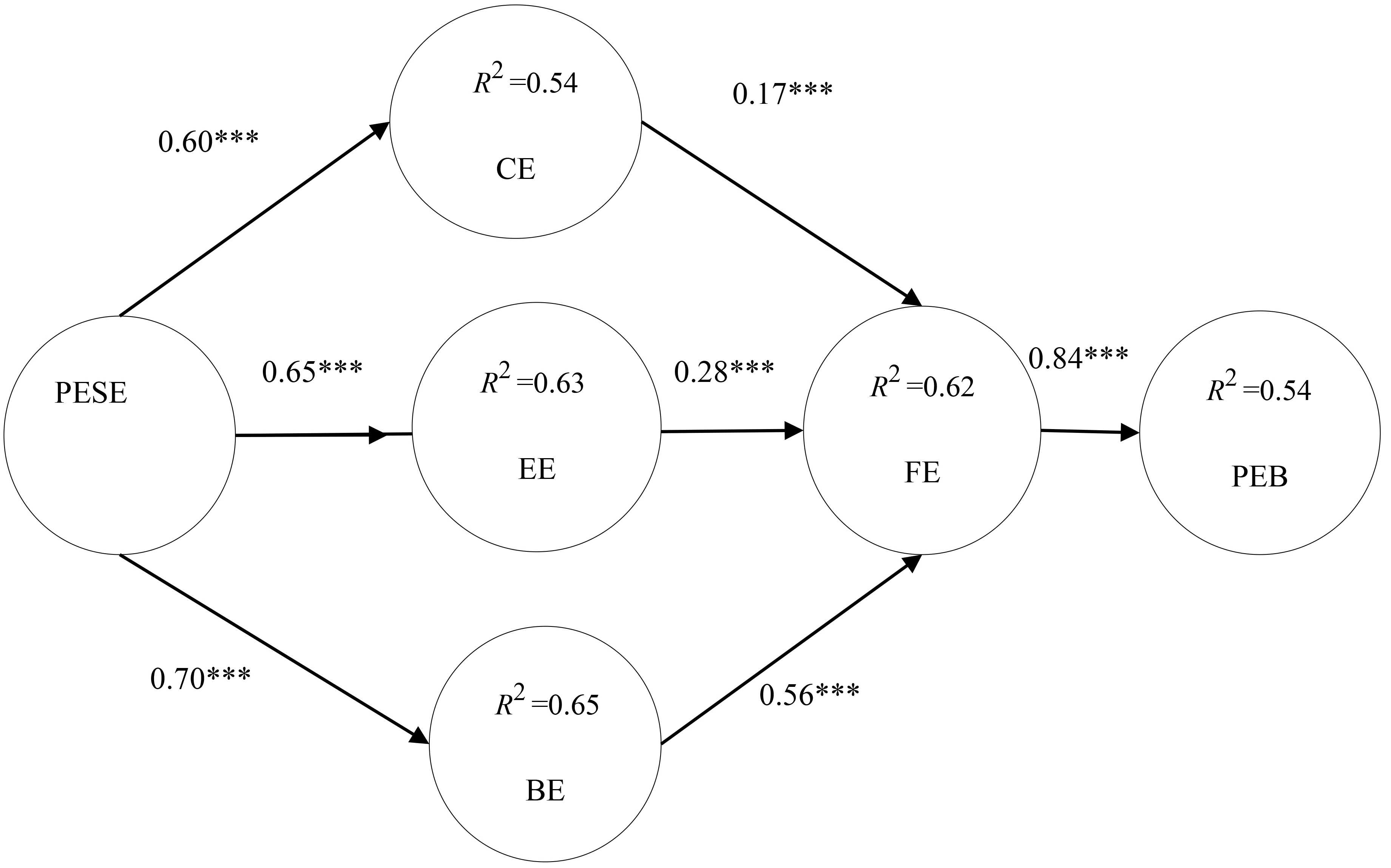 Fig. 2. Validation of the research model. Notes: PESE, physical exercise self-efficacy; CE, cognitive engagement; EE, emotional engagement; BE, behavioral engagement; FE, fluency experience; PEB, persistent exercise behavior, *** p