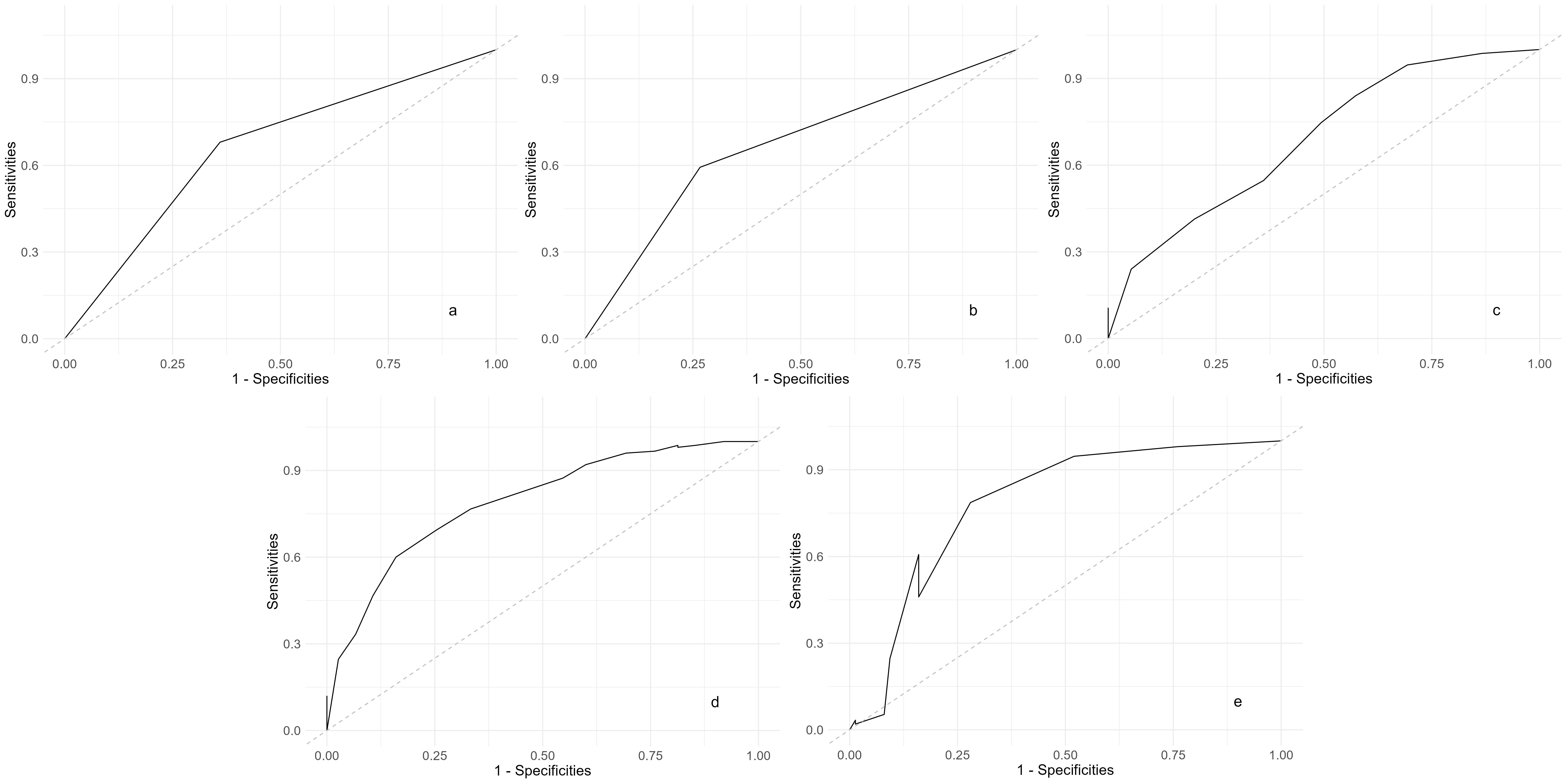 Fig. 1. ROC curves of all influencing factors distinguishing recurrence in elderly SCZ patients during the maintenance period. (a) Medication status: ROC curve showing the predictive ability of medication adherence. (b) Exercise frequency: ROC curve showing the predictive ability of regular exercise. (c) Family care: ROC curve showing the impact of family support. (d) Life events: ROC curve showing the influence of significant life events. (e) Sleep duration: ROC curve showing the role of adequate sleep duration. ROC, the receiver operating characteristic; SCZ, schizophrenia.