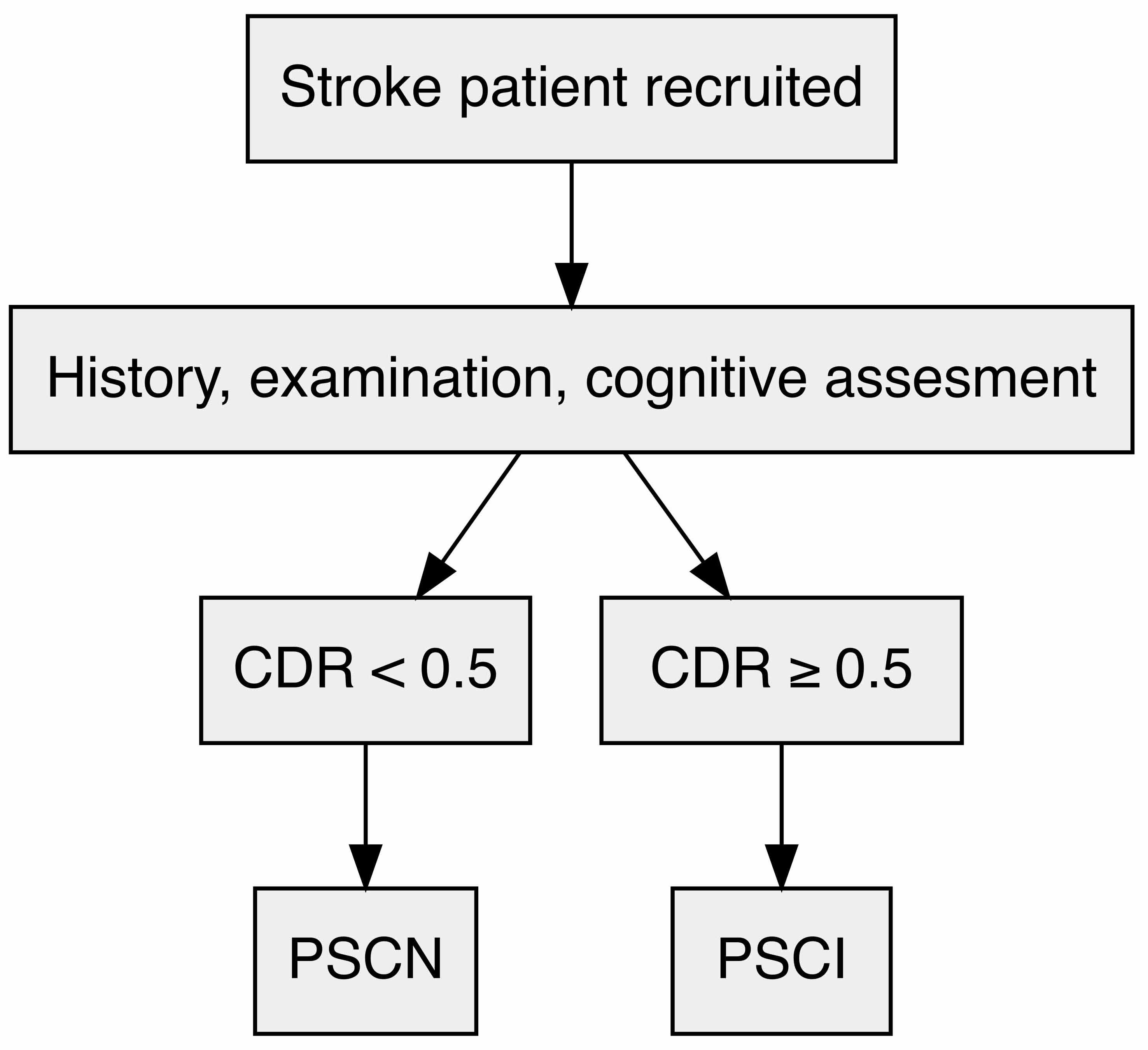 Fig. 1. Flow chart outlining the cognitive function screening process in post-stroke patients. CDR, Clinical Dementia Rating scale score; PSCI, post-stroke cognitive impairment; PSCN, post-stroke cognitive normal.
