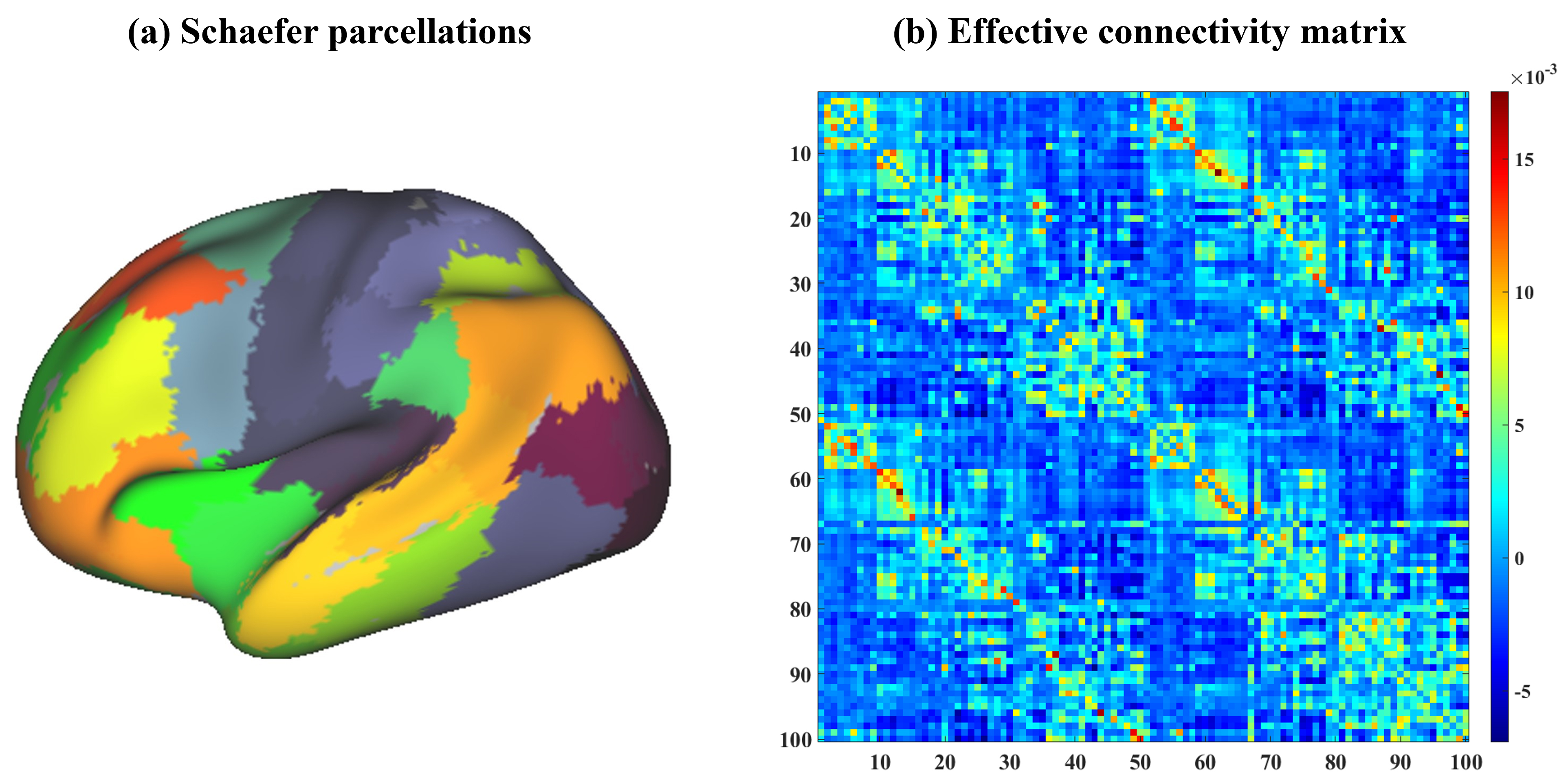 For the estimation of individual EC, we applied the Schaefer atlas [19] (100 parcels, Fig. 1a) to cover the cortex and extracted the first eigenvariate for each region from the preprocessed functional images using fslmeants/FSL. This eigenvariate served as the time series data, which was then utilized in the calculation of EC.