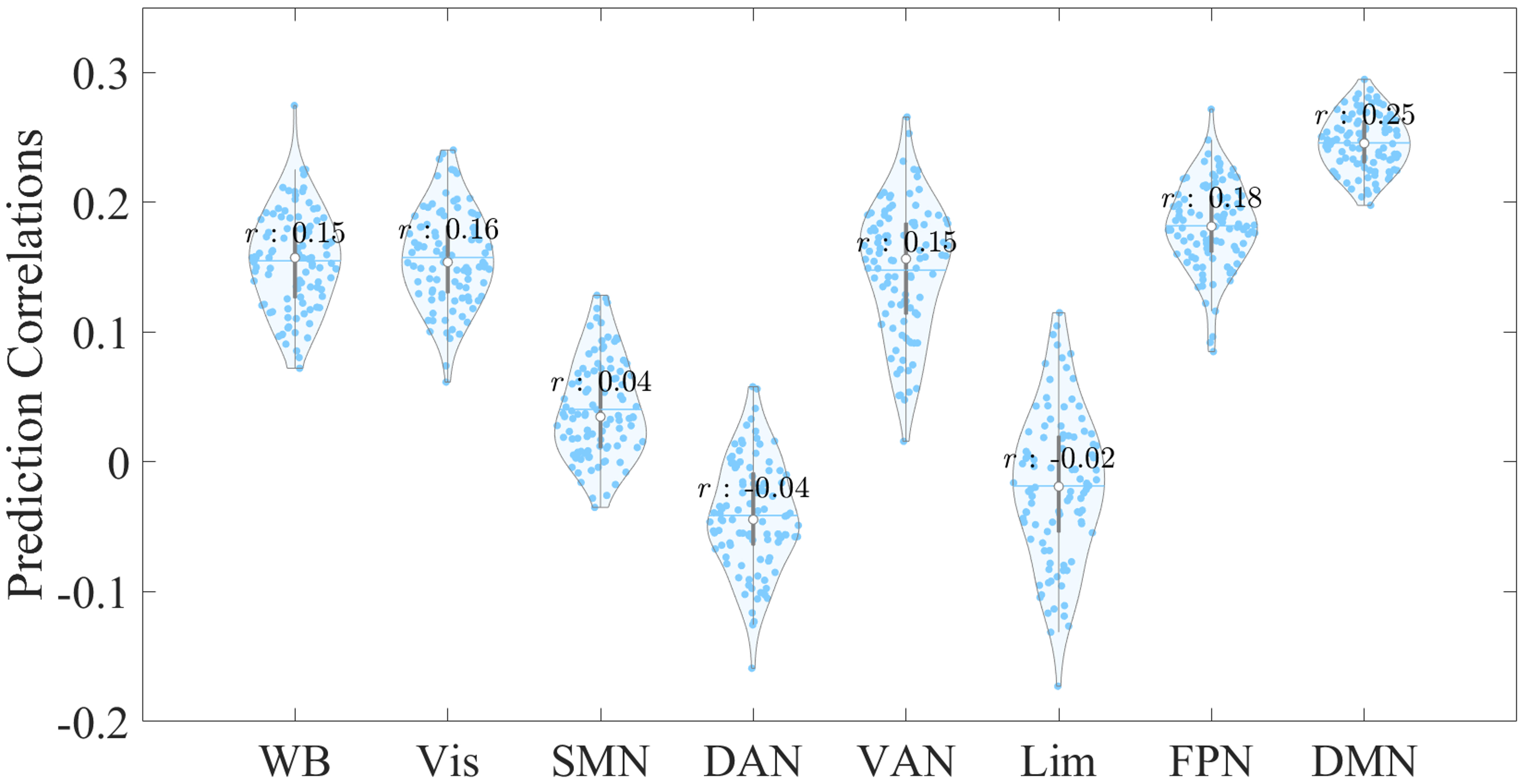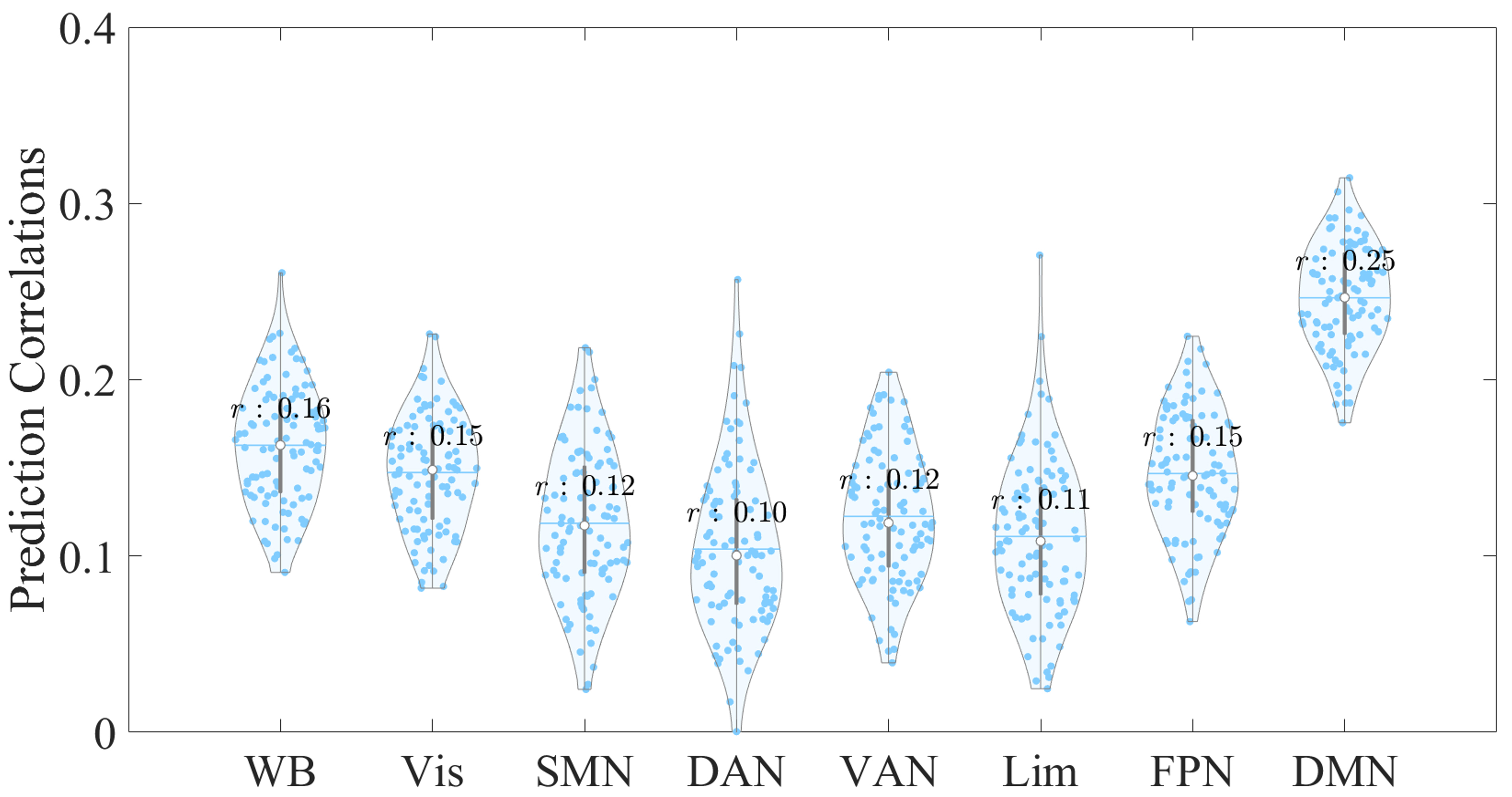 2. The EC features within the default mode network (DMN) showed the highest prediction correlation over other networks.