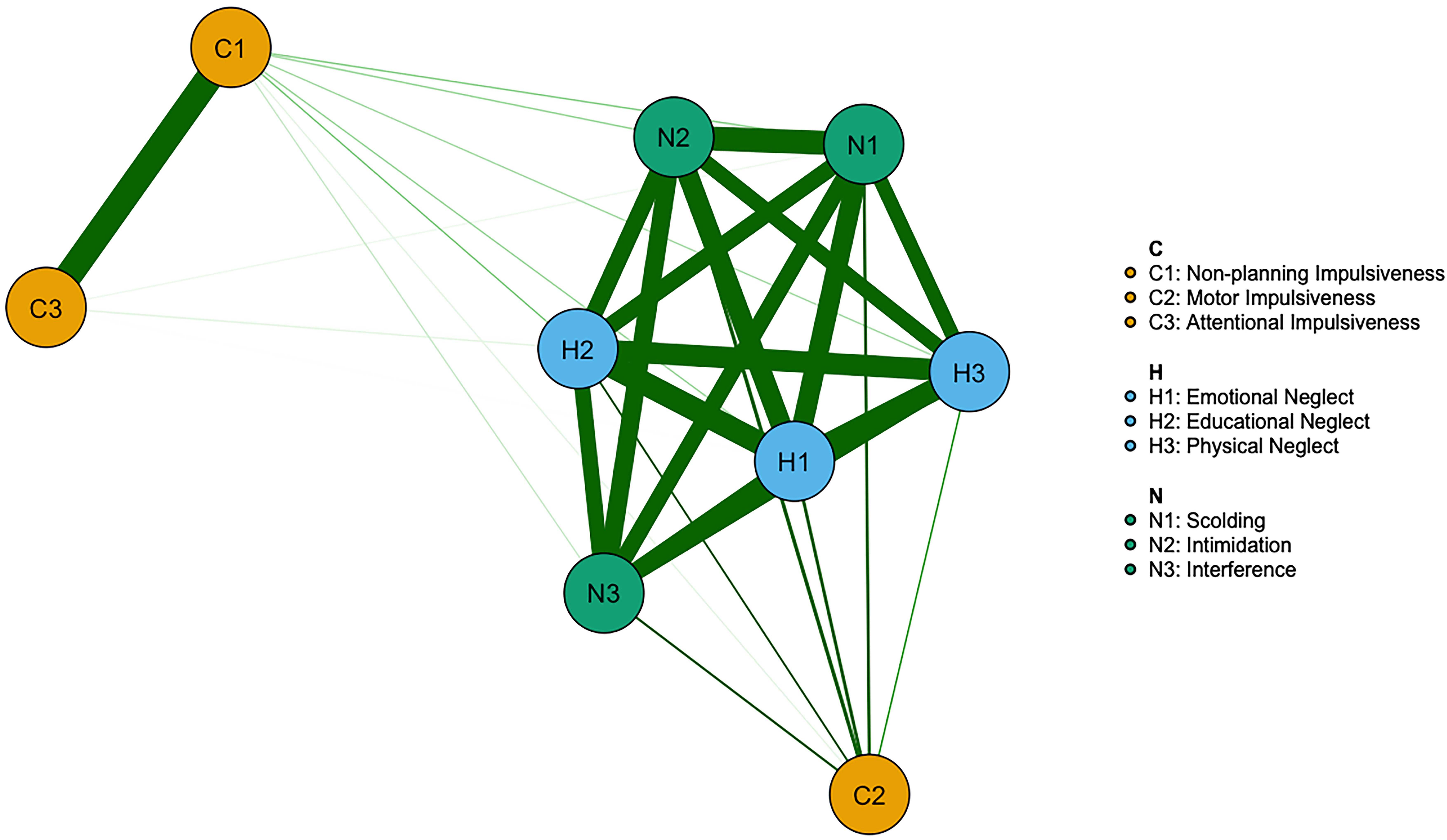 Network analysis is a statistical technique that uses a graphical representation to illustrate the relationships between variables and the strength of their correlations. Unlike traditional methods that rely on predefined dimensions, network analysis reveals the complex, interconnected nature of symptoms without such restrictions [23]. This approach allows for a more intuitive understanding of how symptoms interact and identifies which symptoms are central within the network. For this study, network analysis was applied to explore the relationships between psychological abuse, neglect, and impulsivity.