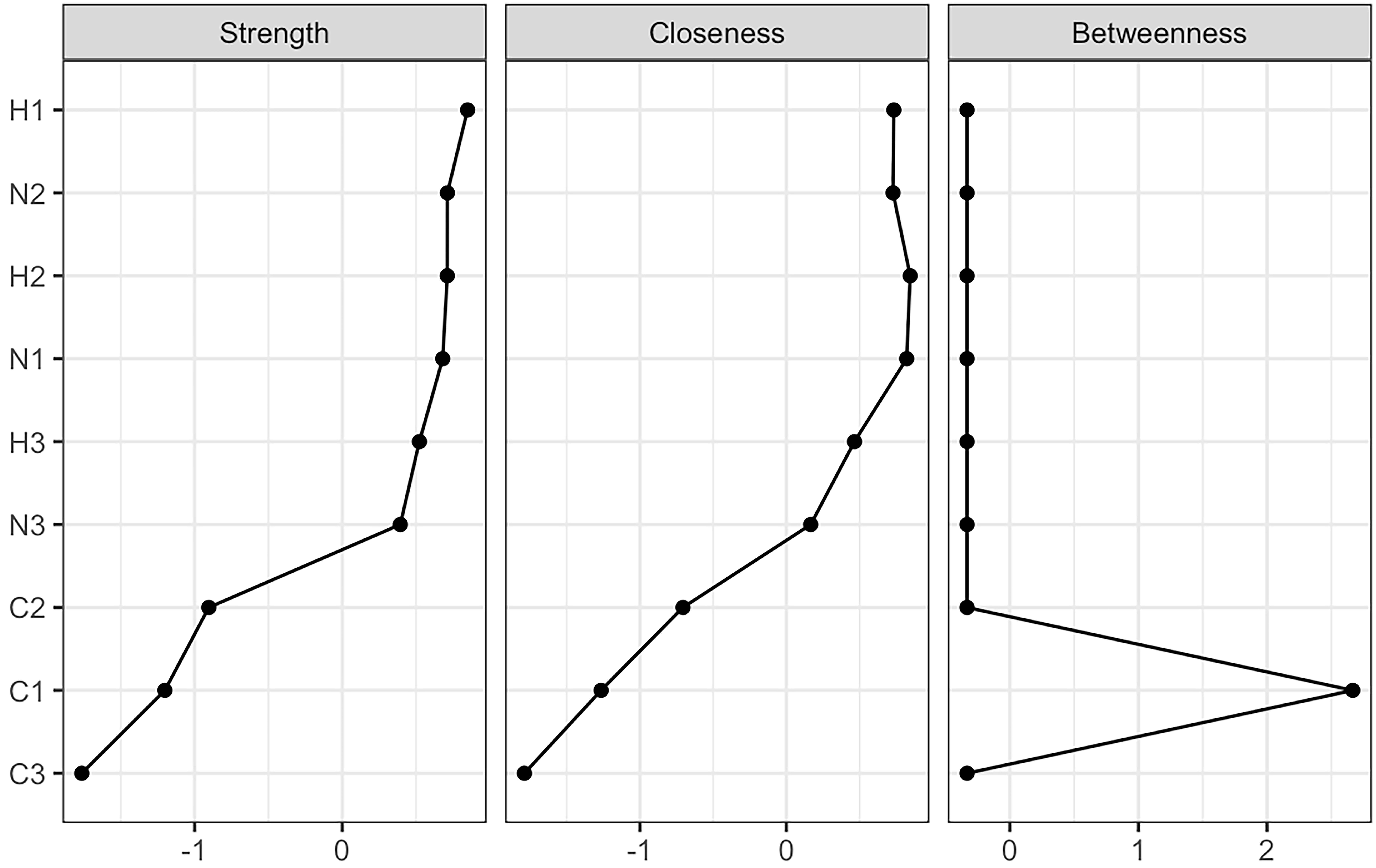 Fig. 2. Centrality indices of network nodes. The nodes represent distinct factors: impulsivity (C1: Non-planning Impulsiveness, C2: Motor Impulsiveness, C3: Attentional Impulsiveness), neglect categories (H1: Emotional Neglect, H2: Educational Neglect, H3: Physical Neglect), and abuse categories (N1: Scolding, N2: Intimidation, N3: Interference).