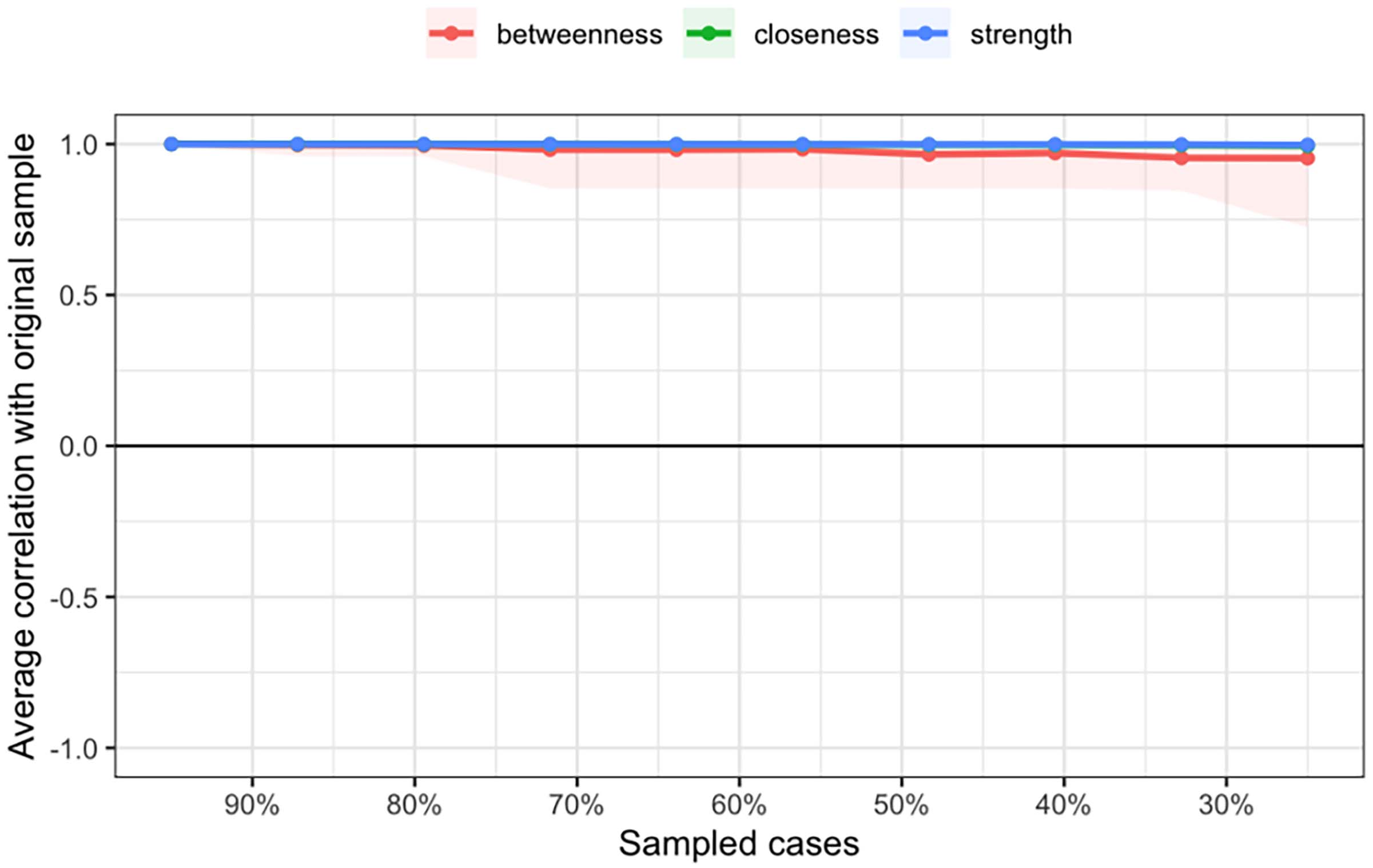 We measured centrality indices of the established network, including node strength, closeness centrality, and betweenness centrality. Node strength refers to the sum of the absolute values of the edge weights connected to a node. Closeness centrality reflects the average distance from one node to all other nodes in the network. Betweenness centrality indicates the number of times a node appears on the shortest path between other nodes. To assess the stability of the centrality indices, we conducted analyses using network model estimation based on data subsets and case-dropping bootstrapping (N = 1000). If the values dropped significantly after removing participants, the centrality indices were considered unstable. The robustness of the network was evaluated using the bootstrapping method in the R package bootnet. The stability analysis was calculated using the CS coefficient (Correlation Stability Coefficient), which represents the maximum proportion of cases that can be dropped while retaining a correlation greater than 0.7 (default) for the original centrality at a 95% confidence level.