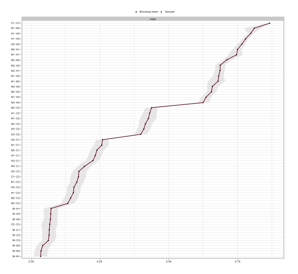 Fig. 4. Bootstrap confidence intervals for edges in the network.