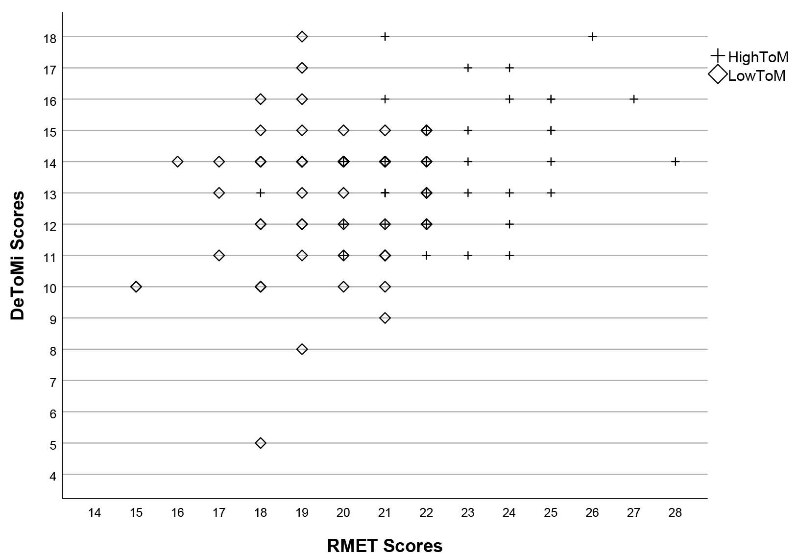 Fig. 1. Scatter plot illustrating Theory of Mind Scores in the high and low Theory of Mind groups. DeToMi, Dokuz Eylul Theory of Mind Index; RMET, Reading the Mind in the Eyes Test.