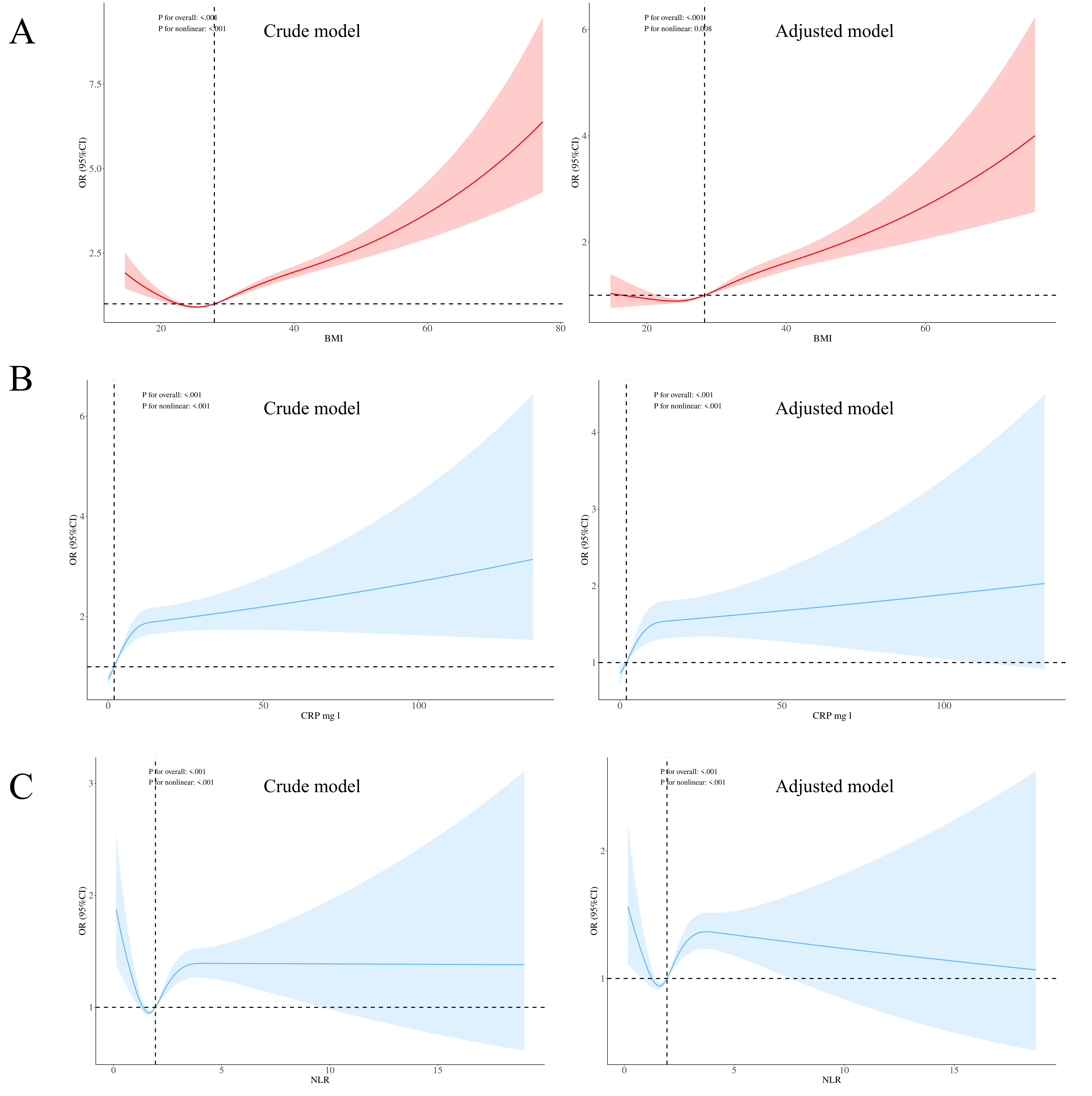 Fig. 2. Correlations between Obesity, Depressive Symptoms, and NLR and CRP Levels. (A) The association between BMI and depressive symptoms. (B) The association between CRP levels and depressive symptoms. (C) The association between NLR and depressive symptoms. CRP is expressed in mg/dL and NLR is calculated as the ratio of neutrophil count to lymphocyte count. Both CRP and NLR were transformed using natural logarithms for the analysis. Crude models were not adjusted, while adjusted models accounted for variables such as age, sex, race, alcohol consumption, smoking status, education, marital status, exercise level, and comorbidities.