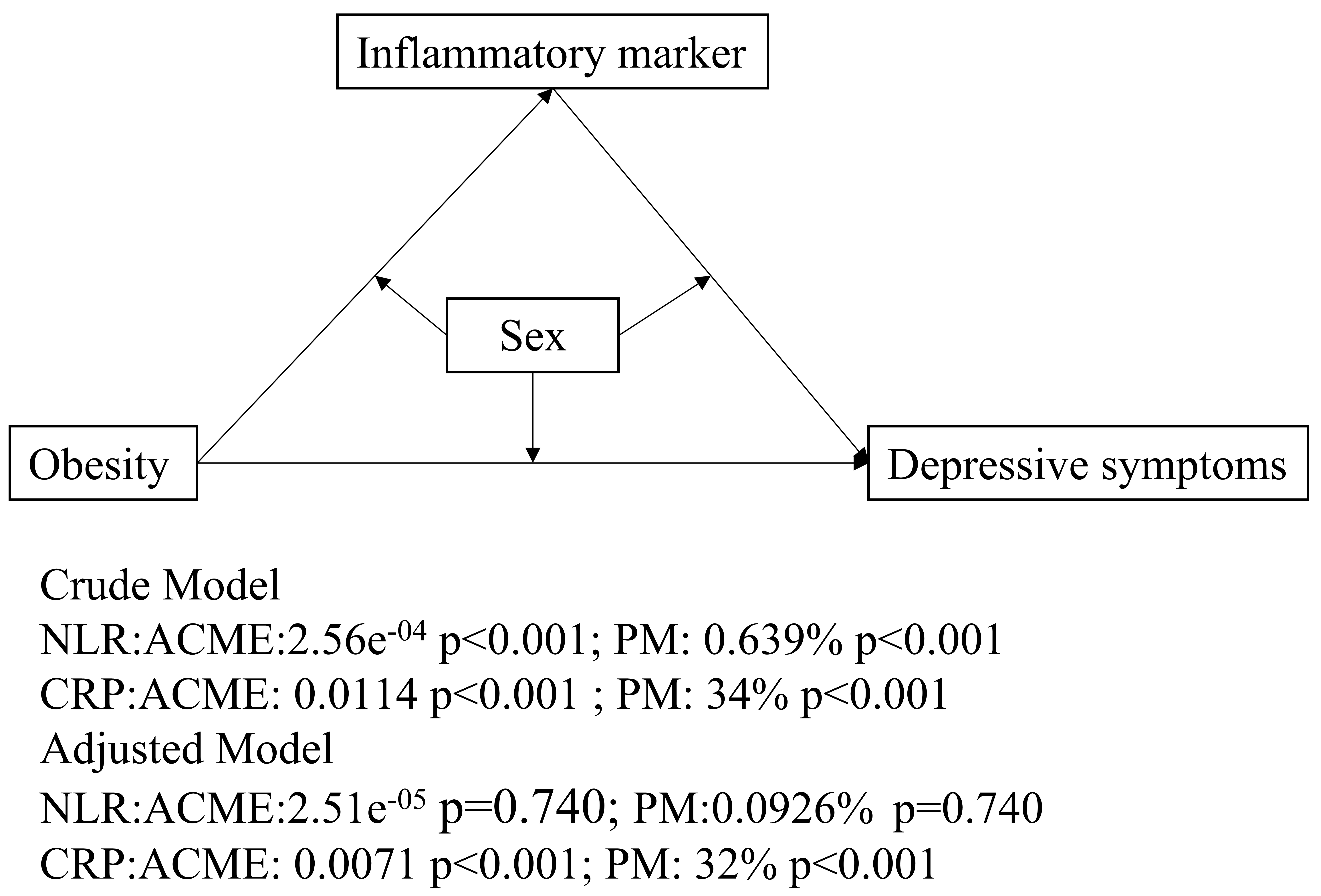This study aimed to address three main questions: (1) Is there a connection between obesity, CRP, and NLR, and depressive symptoms? (2) Do CRP and NLR act as mediators between obesity and depressive symptoms? (3) Do sex differences influence the mediating effects of CRP and NLR in this relationship? Our hypotheses were: (1) There is a positive correlation between obesity, CRP, and NLR, and depressive symptoms; (2) CRP and NLR may partly mediate the effect of obesity on depressive symptoms; (3) Sex differences may influence the mediating role of CRP and NLR in this relationship.
