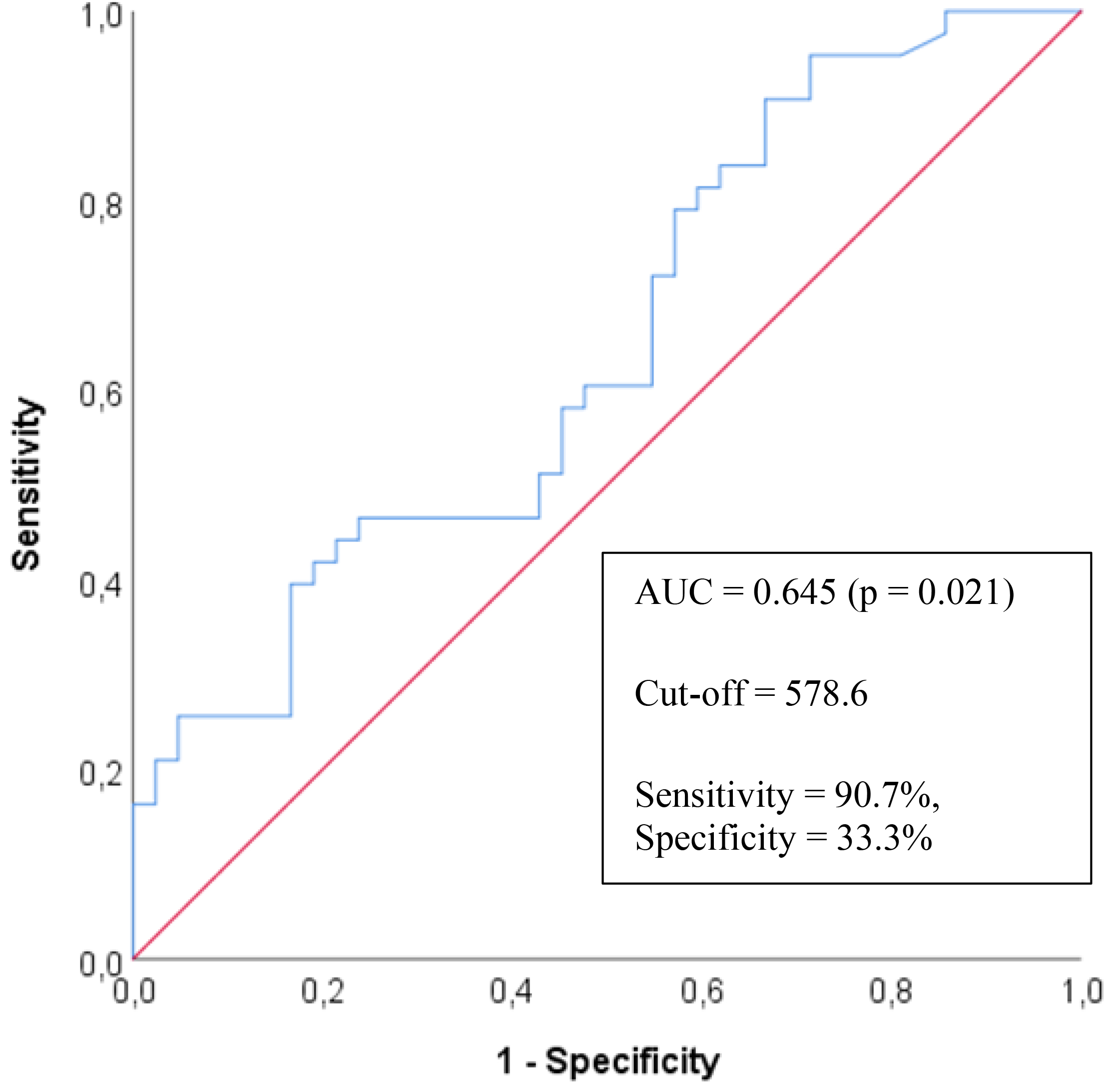 The AUC value for the HMGB1 parameter in predicting ADHD was calculated as 0.645, indicating a statistically significant result (p = 0.021) (Table 4). When the cut-off value was set at 578.6 ng/mL, the model demonstrated a sensitivity of 90.7%, specificity of 33.3%, PPV of 58.21%, and NPV of 77.78% (Fig. 1).