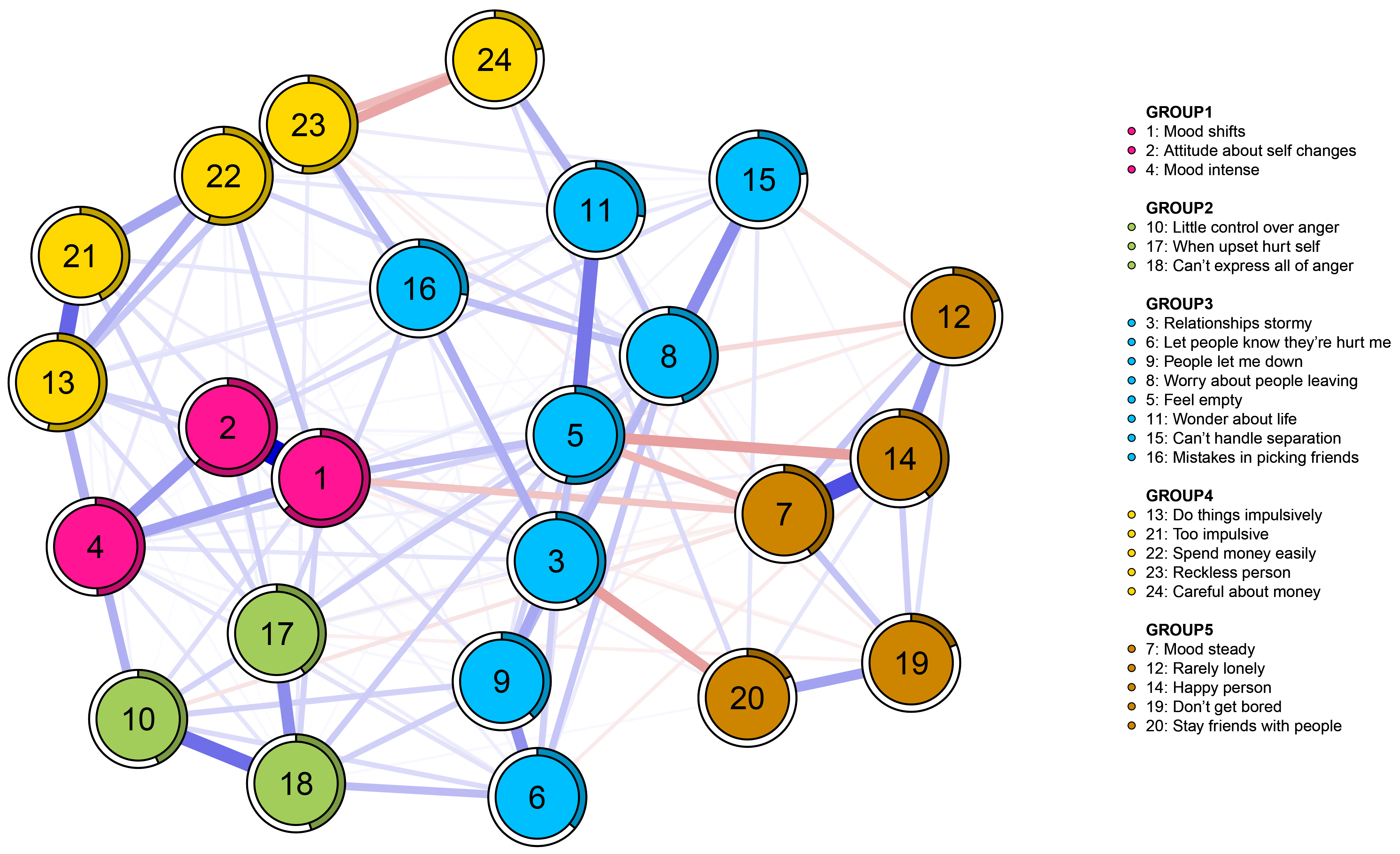 Fig. 1 illustrates the network of BPD symptoms in subjects with affective disorders based on EGA. Community 1 comprises items 1, 2, and 4; Community 2 includes items 10, 17, and 18; Community 3 comprises items 3, 5, 6, 8, 9, 11, 15, and 16; Community 4 encompasses items 13, 21, 22, 23, and 24; and finally, Community 5 includes items 7, 12, 14, 19, and 20 (Supplementary Fig. 1). The results of bootstrap iterations aimed at examining dimensional stability showed that the five community solution exhibited 50.6% of the replication rate (506 of 1000 samples). Furthermore, the results of verifying the stability of each item (Supplementary Fig. 2) revealed that all items exhibited an acceptable level of stability, except for the following three items, which had an item replication rate of less than 0.7: items 11 (“Wonder about life”), 5 (“Feel empty”), and 20 (“Stay friends with people”) [24]. Supplementary Fig. 3 depicts the network structure of BPD symptoms derived from the control group based on exploratory graph analysis (EGA). The results showed that Community 1 comprised items 1, 2, 4, 6, 10, and 13; Community 2 included items 21, 22, and 23; Community 3 consisted of items 3, 8, 9, 15, 16, 17, and 18; and finally, Community 4 comprised items 5, 7, 11, 12, 14, 19, 20, and 24 (Supplementary Fig. 4).