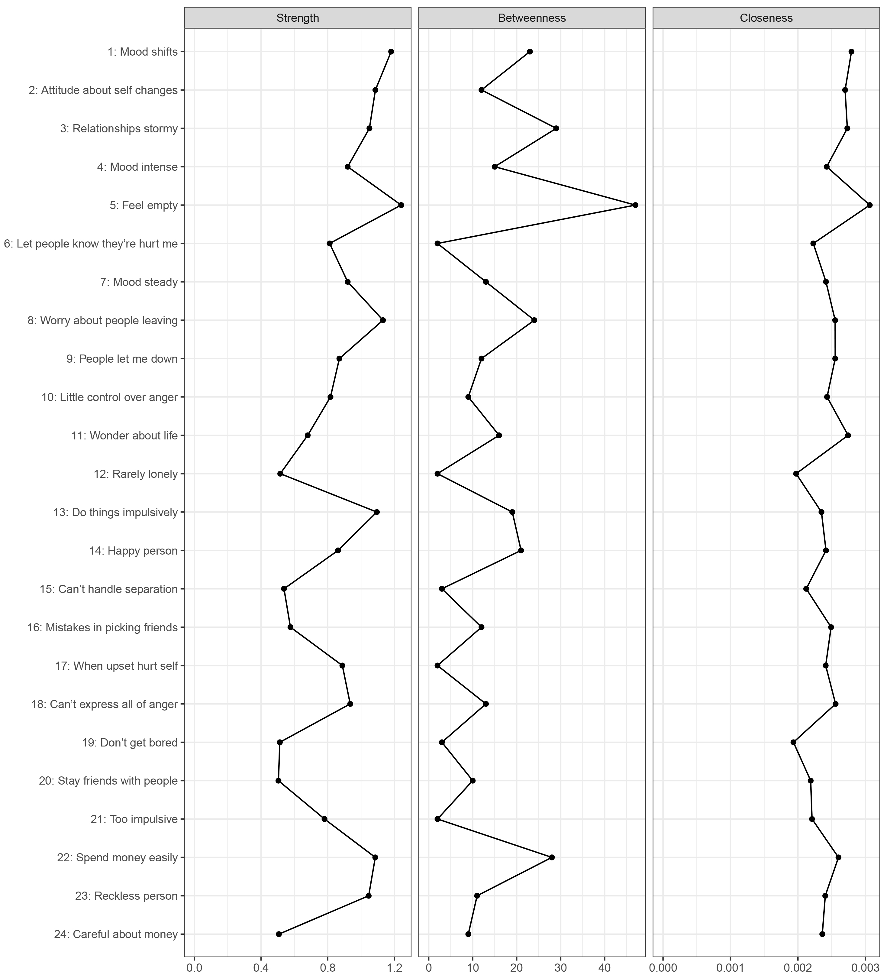 To examine prominent BPD symptoms within the network, an analysis of three centrality indices was conducted, encompassing strength, closeness, and betweenness. Strength centrality was computed as the total of the absolute weights of the connected edges to a node, reflecting the extent to which the activation of a node is related to the activation of its connected nodes. Closeness centrality was computed as the reciprocal of the average shortest distance from one node to all other nodes in the network, demonstrating how easily a node can be reached from other nodes. The extent to which a node acts as a mediator in connecting two other nodes along its shortest path determines its betweenness centrality [26]. Centrality indices, including strength, closeness, and betweenness, were calculated using the R package qgraph (version 1.9.5) to assess the importance of each node within the network [27].