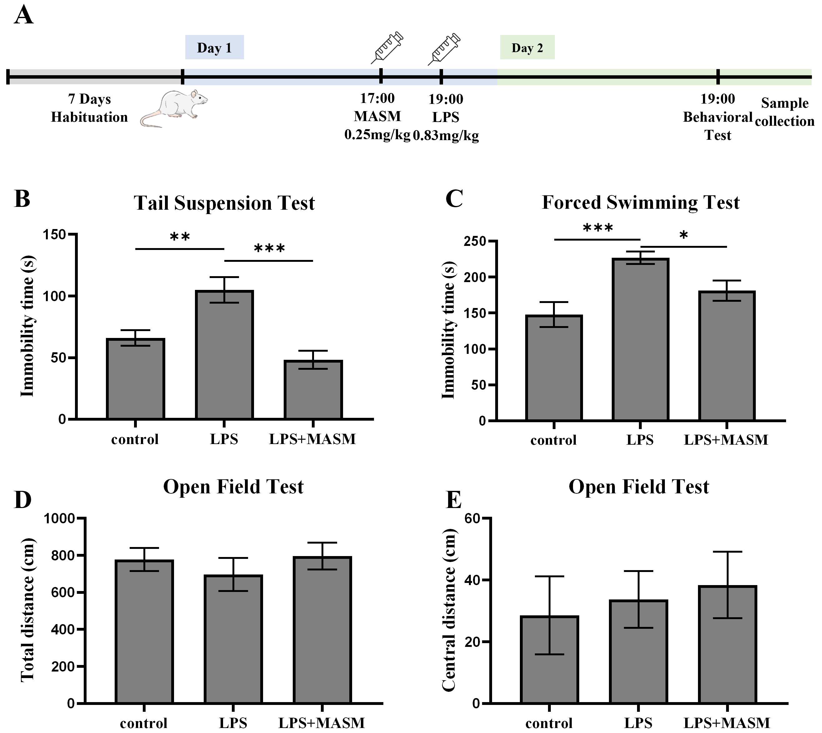 Following intraperitoneal injection of LPS (0.83 mg/kg), MASM was administered. Depressive-like behaviors were assessed through the forced swim test (FST) and tail suspension test (TST). To further explore the mechanisms, LPS-induced BV2 microglial cell models were established. Enzyme-linked immunosorbent assay (ELISA) was used to quantify the expression of TNF-α and high mobility group box 1 (HMGB1), while immunoblotting was performed to assess heme oxygenase-1 (HO-1), sirtuin 1 (SIRT-1), p62, and microtubule-associated protein 1A/1B-light chain 3-phosphatidylethanolamine conjugate (LC3-II) expression. Reactive oxygen species (ROS) levels were evaluated using flow cytometry.