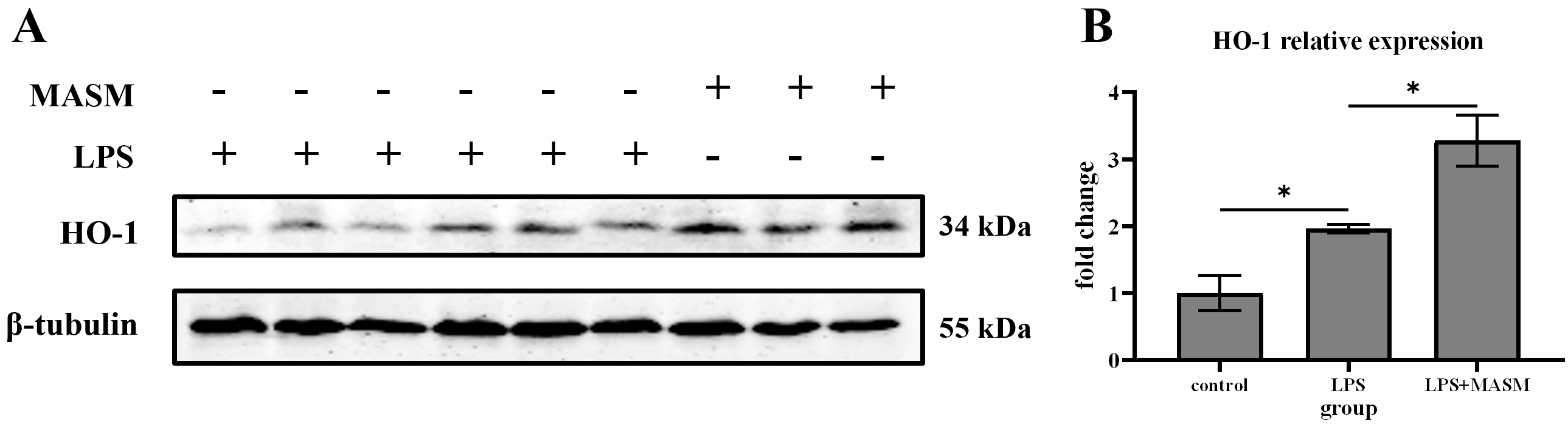 Fig. 2. MASM reduces LPS-induced effects on HO-1. (A) Representative blots of HO-1 expression. (B) Representative bar graph of HO-1 expression analysis. Data presented as mean
