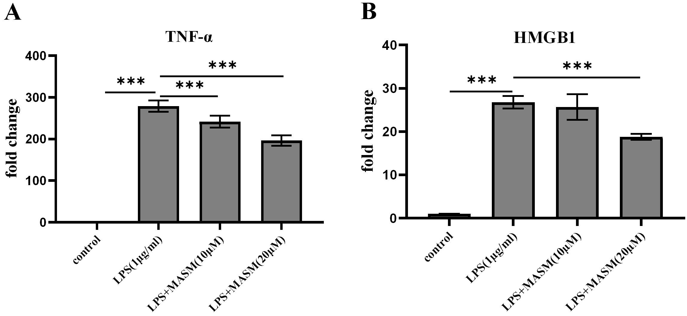 To investigate whether MASM modulates LPS-induced proinflammatory responses, BV2 microglial cells were pretreated with either vehicle (1% DMSO, ST038-100ml, Beyotime) or MASM at concentrations of 10 µM and 20 µM for 24 hours, followed by stimulation with LPS (1 µg/mL) or PBS for an additional 24 hours. We then evaluated the effects of varying MASM concentrations on the levels of proinflammatory markers TNF-
