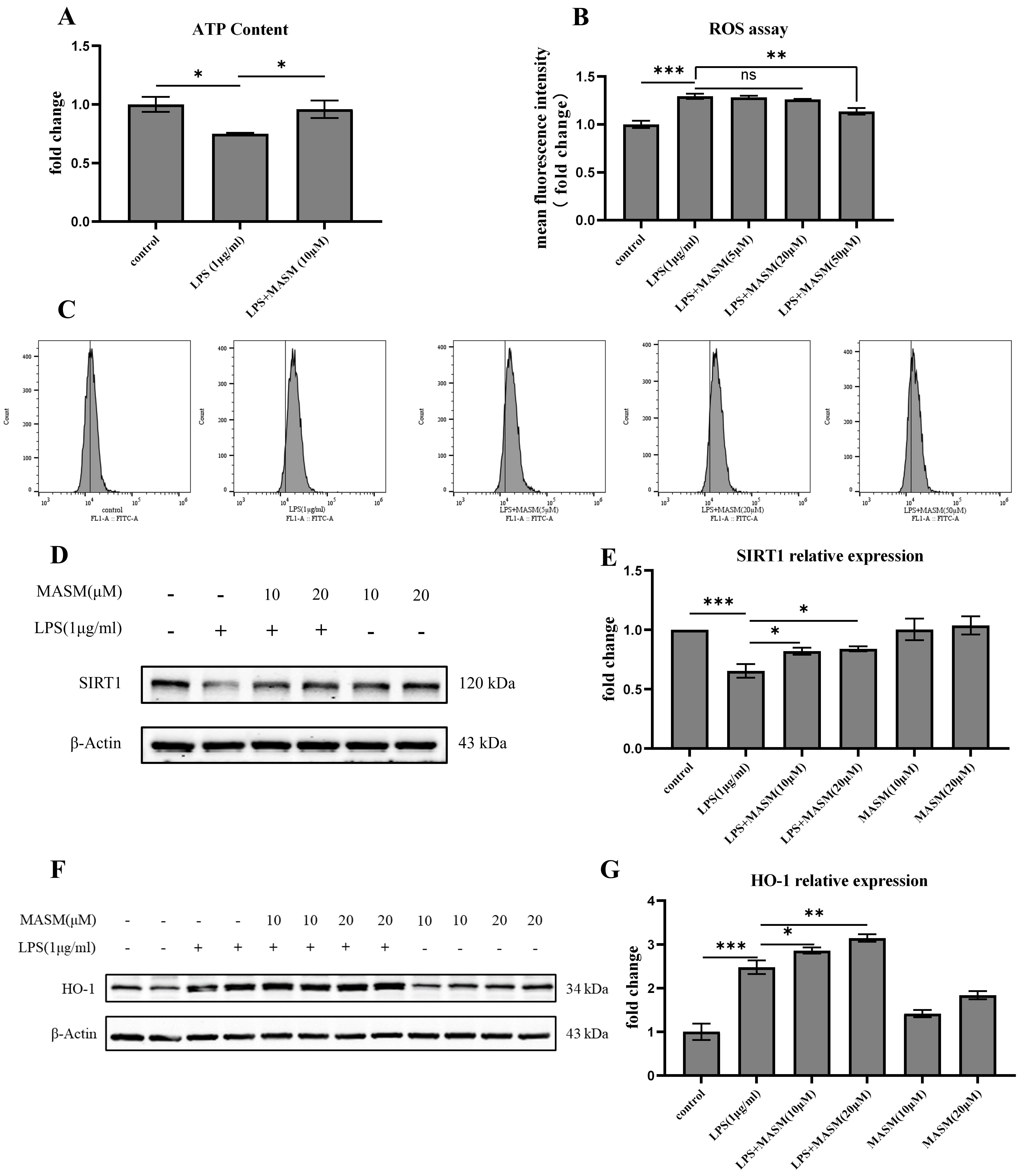 To further investigate the potential antioxidative effects of MASM, we measured and analyzed levels of ATP, ROS, deacetylase SIRT-1, and HO-1 in BV2 cells. LPS (1 µg/mL) treatment led to a significant reduction in ATP levels and an increase in ROS production, indicating oxidative stress in the cells (Fig. 4A–C). MASM treatment at 10 µM effectively reversed the LPS-induced ATP reduction, while MASM at 50 µM significantly decreased ROS levels. Additionally, as shown in Fig. 4D–G, LPS (1 µg/mL) stimulation resulted in a notable decrease in SIRT-1 levels and an increase in HO-1 expression, both of which were ameliorated by MASM treatment at 10 or 20 µM. These findings suggest that MASM may alleviate oxidative stress in microglia induced by LPS.