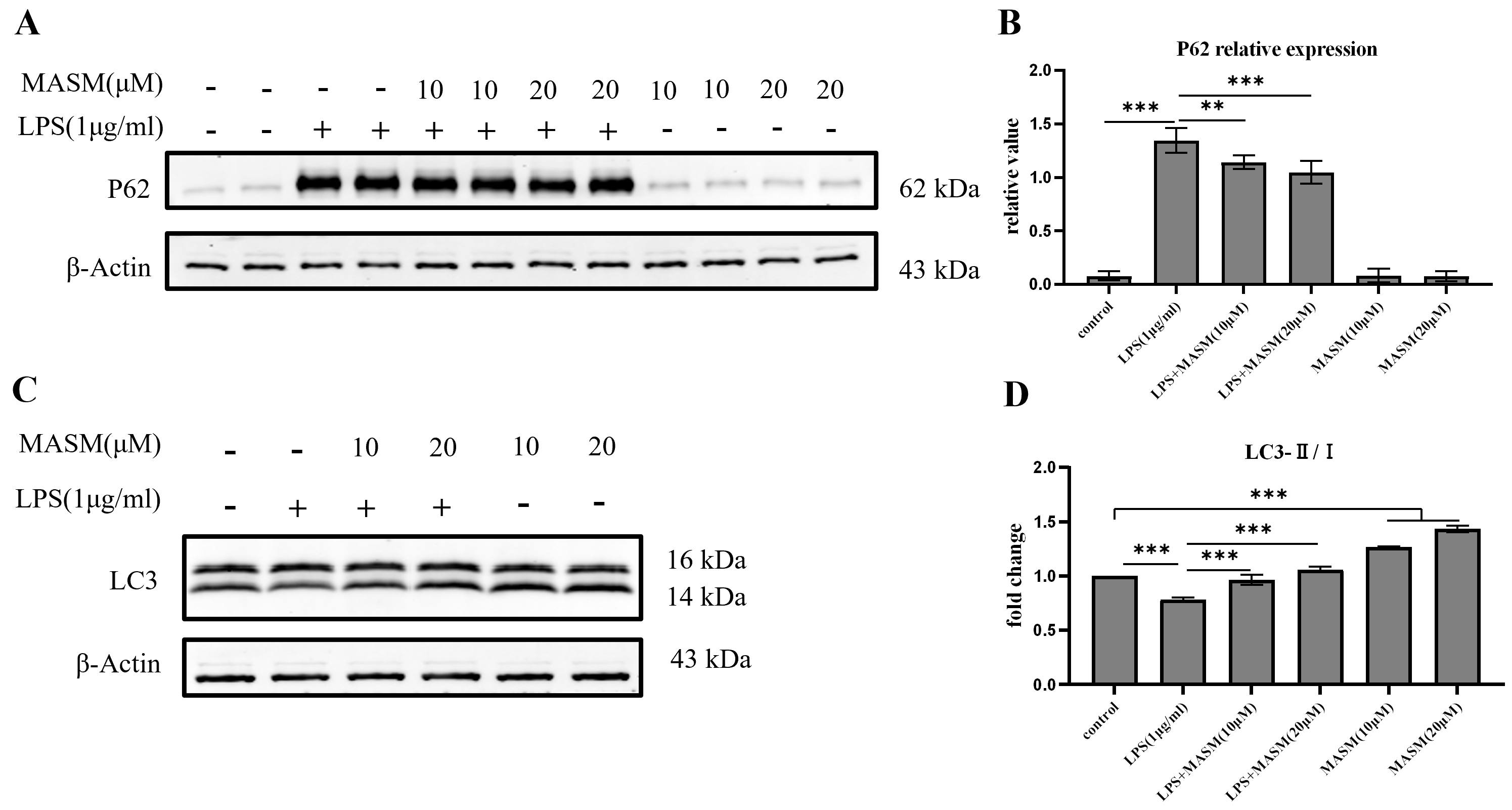 Autophagy plays a crucial role in regulating microglial inflammation. However, it remains unclear whether MASM modulates LPS-induced microglial inflammation through autophagic mechanisms. To explore this, we analyzed the expression of the LC3 and p62, key markers of autophagic activity, using western blotting. Following stimulation with LPS (1 µg/mL), BV2 cells demonstrated a significant reduction in the LC3-II/I ratio and an increase in p62 expression, indicating disrupted autophagic activity. In contrast, pretreatment with MASM at 10 or 20 µM significantly elevated the LC3-II/I ratio and reduced p62 levels (Fig. 5A–D), suggesting a restoration of autophagic function. Under normal culture conditions, MASM treatment significantly increased LC3-II/I expression in BV2 cells, suggesting a potential role of MASM in promoting autophagic flux (Fig. 5D).