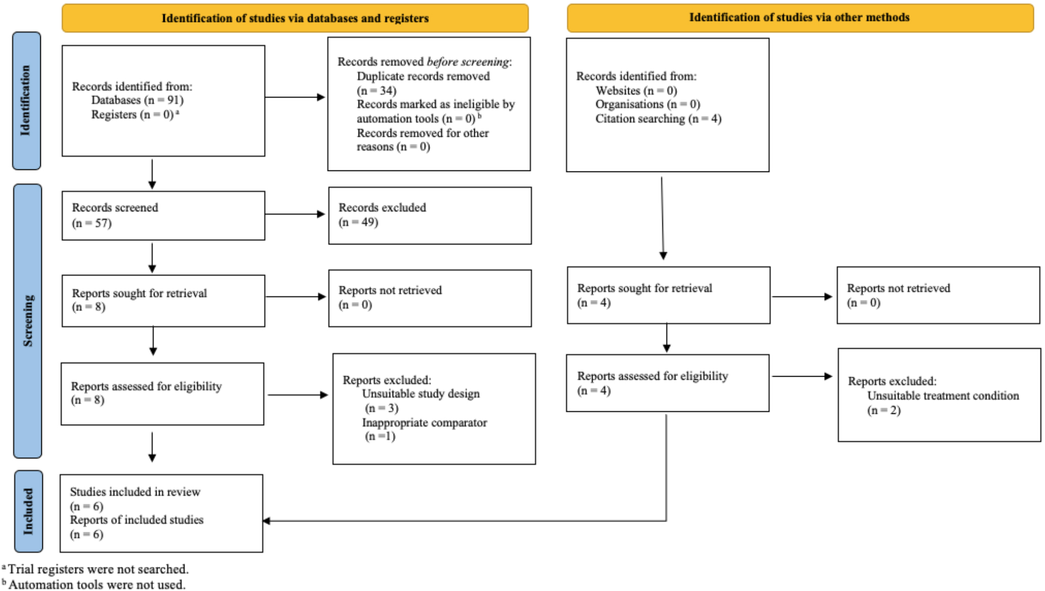The identified citations were imported into Covidence [61], a systematic review software, to streamline screening and extraction. Fig. 1 displays the PRISMA study selection flowchart based on eligibility criteria. After removing duplicates, the titles and abstracts of 61 studies were screened, excluding 49 unsuitable studies. Studies were deemed unsuitable if they did not include an MBI, did not measure depression or IA or were a pilot study, dissertation, systematic review or meta-analysis. Two independent reviewers conducted the screening process, achieving a 98.25% agreement rate. A full-text review of the remaining 12 studies led to the exclusion of six more due to unsuitable study design (n = 3), inappropriate comparator (n = 1), and unsuitable intervention (n = 2). The same two independent reviewers also performed the full-text review, with 100% agreement on the included studies. The final review included six studies that met the eligibility criteria.