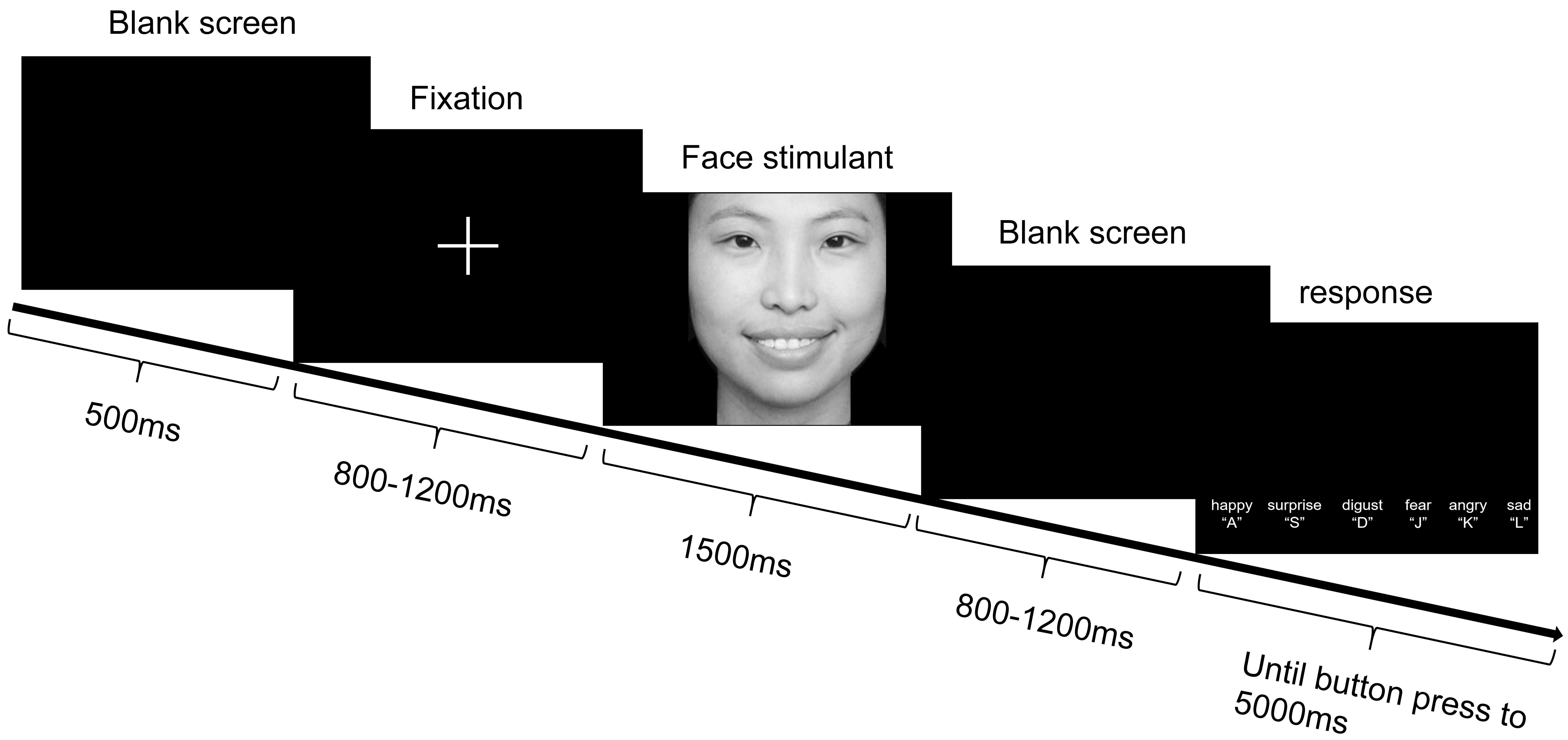 A paradigm of experimental procedure for emotional face recognition task. Note: Each trial proceeded as follows: First, a white fixation point appeared in the center of the screen for 500 ms. Subsequently, a blank screen was displayed for a randomized duration of 800 to 1200 ms. Next, an emotional face stimulus was presented for 1500 ms. After the stimulus disappeared, another blank screen appeared for a randomized duration of 800 to 1200 ms. Finally, the emotional face selection interface was displayed. In the selection interface, participants pressed the selection key to proceed to the next trial. If no response was made, the selection interface automatically advanced to the next trial after 5000 ms.
