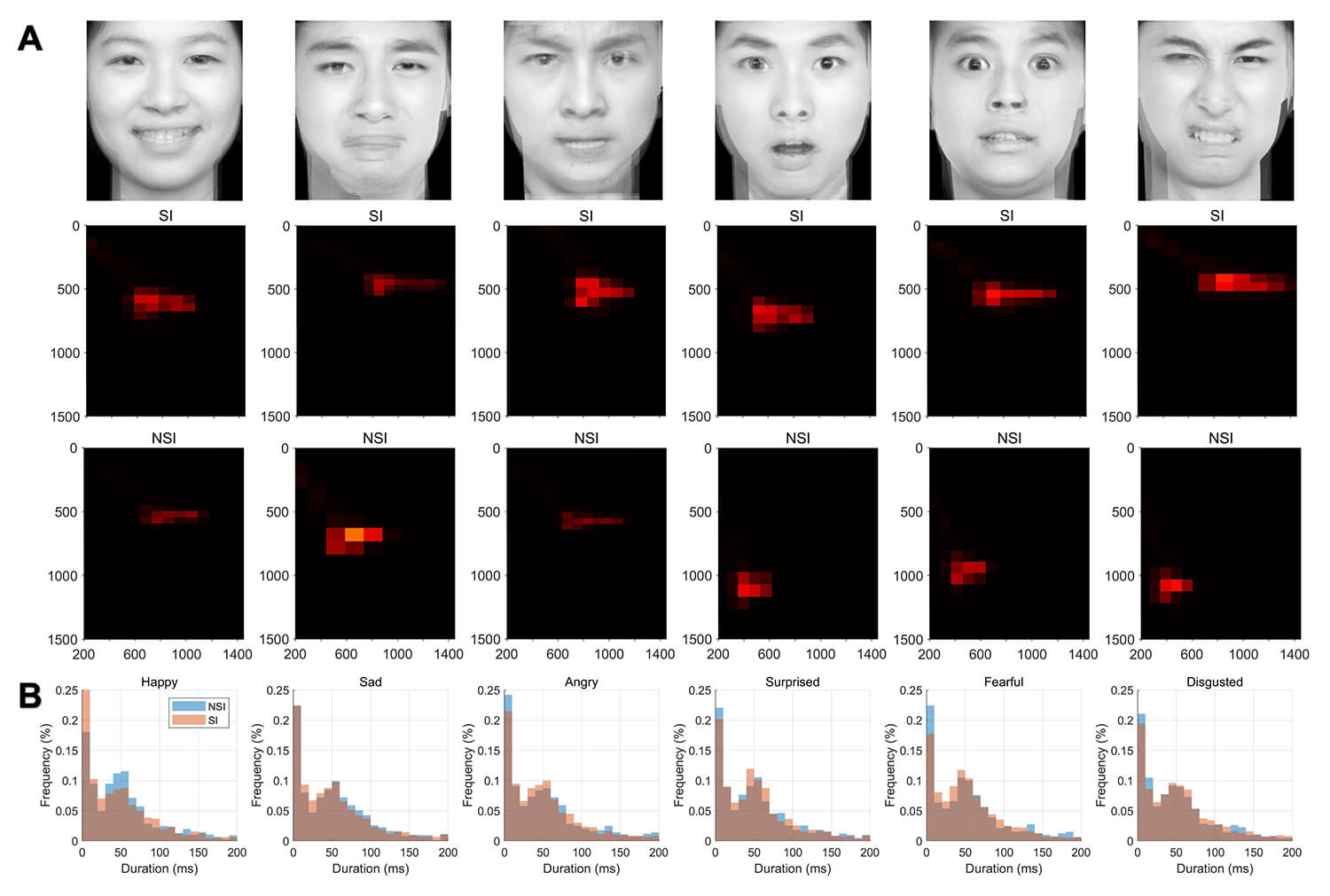 Fixation density plots and fixation duration distributions for SI and NSI group. (A) Heatmaps depicting fixation locations for the groups across six emotional stimuli. The intensity of the heatmaps indicates fixation density on facial regions. (B) Histograms showing the distribution of fixation durations for the groups across the same six emotional stimuli. The x-axis represents fixation duration (ms), and the y-axis represents the percentage of fixations.