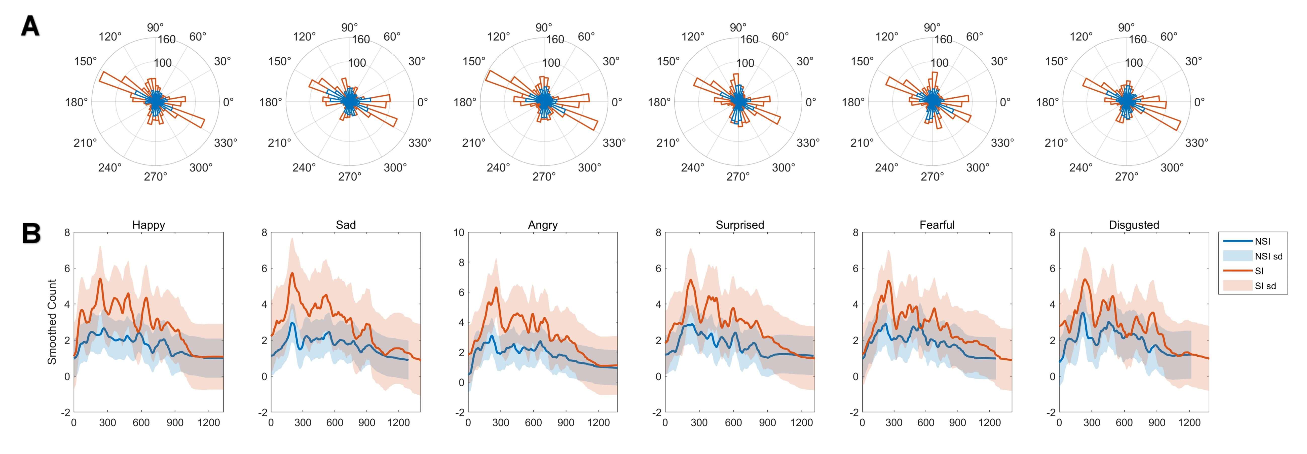 six emotional stimuli. (A) Polar plots illustrating the distribution of saccade