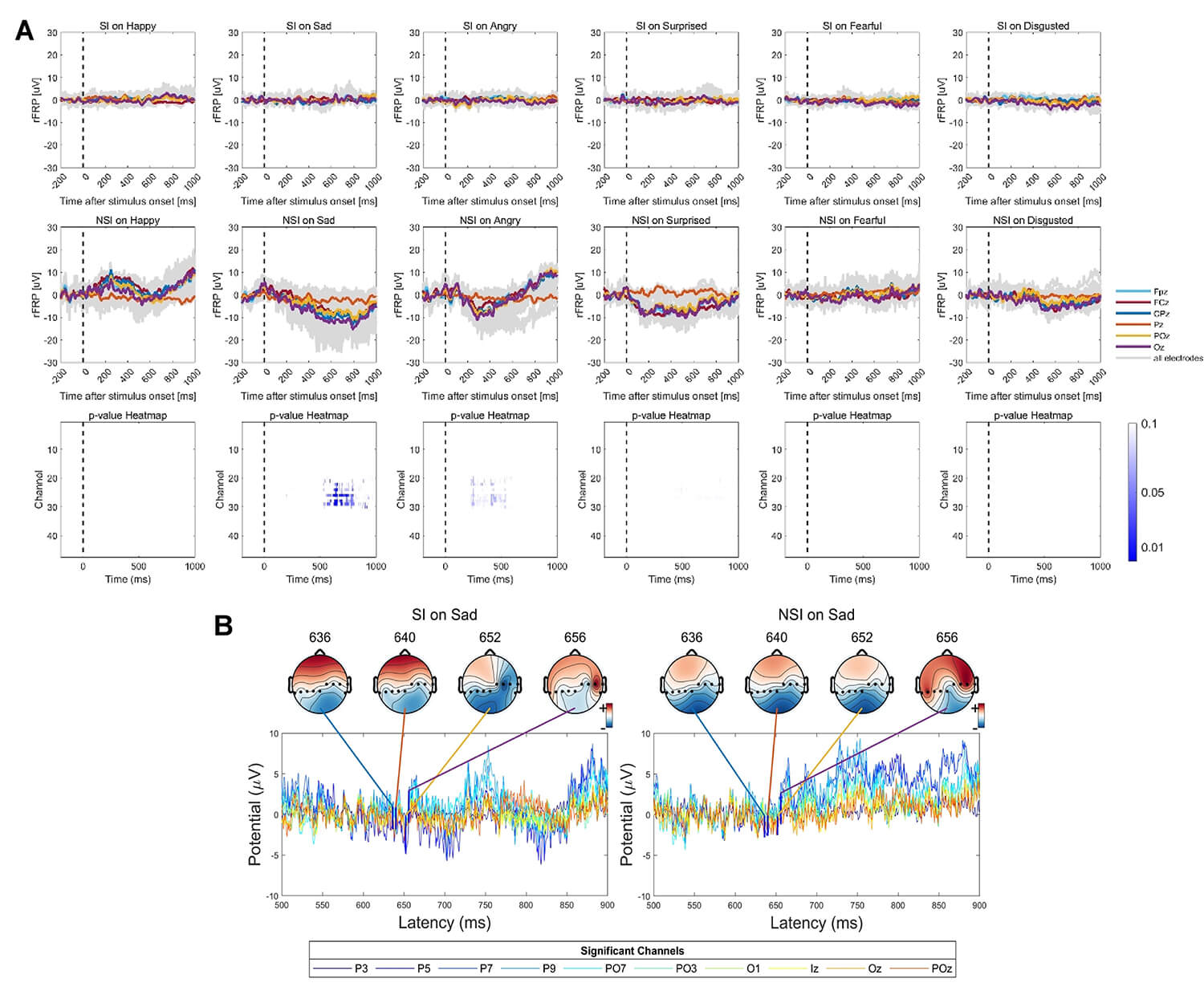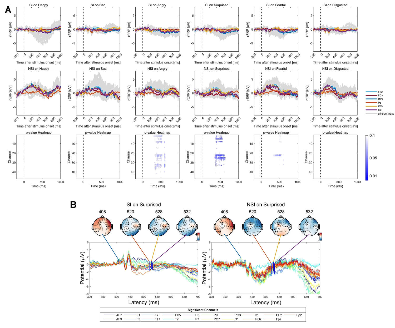 Fig. 4A depicts the rERPs elicited by the stimulus onset as a function of emotional condition. Under different emotional states, the amplitude range of the central electrodes was illustrated while the statistical results across all channels and timeframe were presented in the bottom of Fig. 4A. These findings highlight the significance of regression ERPs in capturing subtle yet meaningful variations in neural processing during emotional face recognition. As shown in Fig. 4A, the SI group exhibited significantly different wave amplitudes after 450 ms when exposed to emotional facial stimuli, particularly under the surprise condition, compared to the NSI group. This divergence suggests altered neural processing of emotional stimuli in individuals with SI. Further, Fig. 4B, which focuses on the differences in rERPs under the surprise condition, reveals that the SI group had different amplitude with the NSI group from 368–628 ms. The most statistically significant p-value presented at channel P7 (timeframe = 408, p = 0.026) and FT7 (timeframe = 520/528/532, p = 0.027/0.028/0.029), both located near the left lateral area. The SI group shows significantly lower amplitude in identifying surprise at these time frames compared to the NSI group, suggesting that the SI group are less sensitive to surprise emotion than the NSI group.