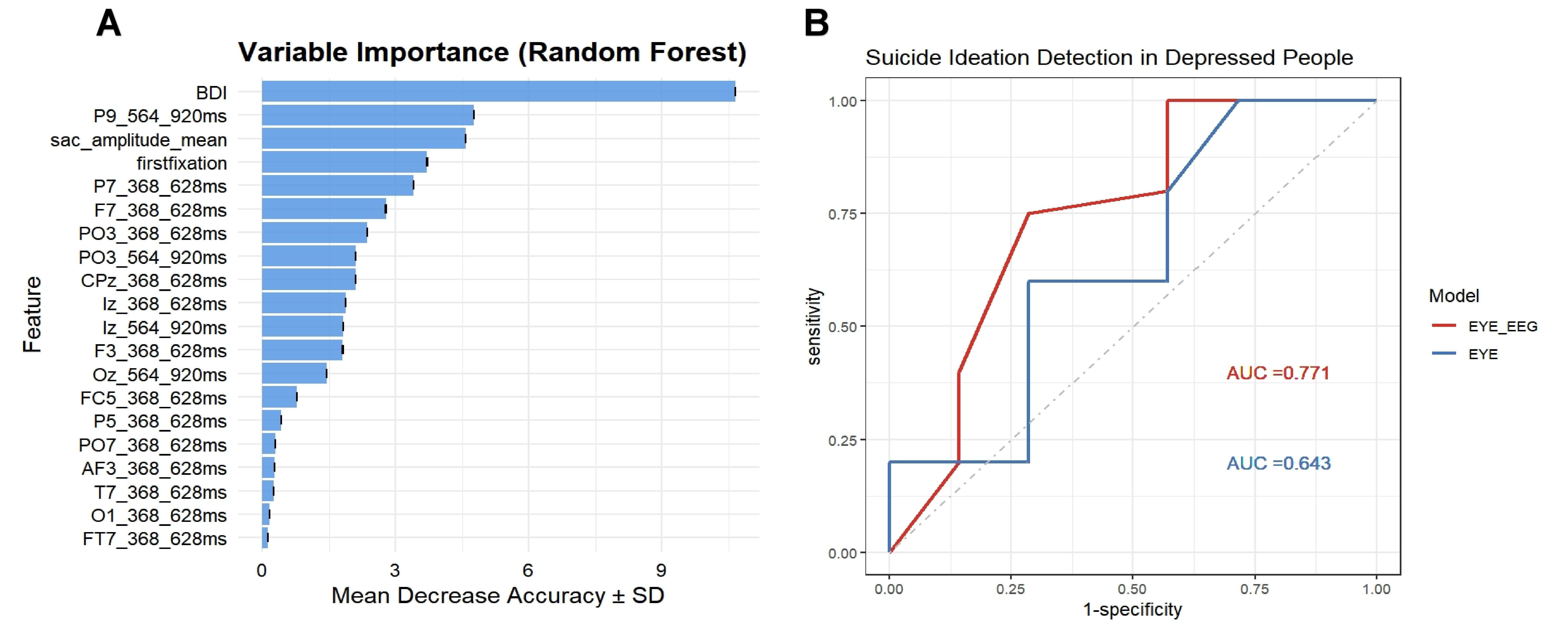 To predict SI, all characteristics revealed from the clinical characteristics, eye movement and EEG data were used as features and the suicide ideation as a target variable. Initially, a Random Forest model was trained on the full dataset with the target variable to evaluate feature importance using the random Forest package. The importance of each feature was quantified using the Mean Decrease in Accuracy, and the top features were ranked accordingly. To further assess the predictive power of individual features, we computed the Area Under the Curve (AUC) for each feature by fitting a univariate Receiver Operating Characteristic (ROC) curve using the pROC package (version 1.18.0; https://cran.r-project.org/package=pROC) in R v4.3.2 (R Core Team, Institute for Statistics and Mathematics, Vienna, Austria). Features with an AUC greater than 0.6 were selected for model training to ensure only those with reasonable discriminatory power were retained. These features, along with the group label, were combined into a new dataset for model development. The data were then randomly split into training (80%) and testing (20%) subsets. A Random Forest model with 500 trees was trained on the selected features from the training set. Probabilities for the positive class were obtained from the testing set predictions. The classification performance was evaluated by calculating the AUC of the ROC curve and predicted class labels were generated using a probability threshold of 0.5.