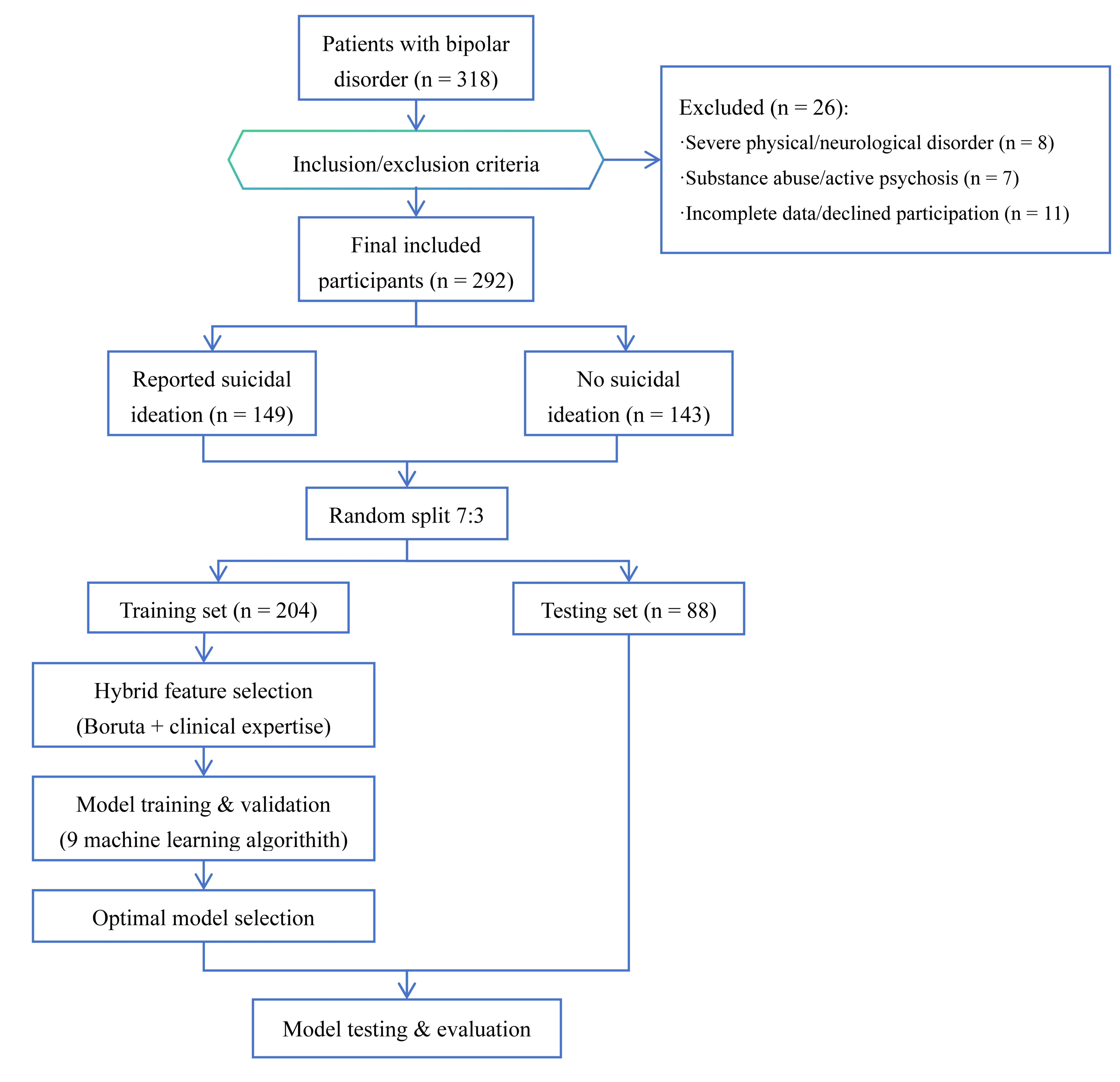 This study employed a cross-sectional design. Patients with BD were enrolled from three tertiary hospitals between July 2021 and July 2024. All participants were randomly allocated to training (n = 204) or testing (n = 88) sets at a 7:3 ratio. A hybrid feature selection strategy integrating the data-driven Boruta algorithm with clinical expertise was used to identify potential predictors of SI. Nine machine learning algorithms were applied to the training set to construct SI prediction models. The optimal model was selected through comprehensive evaluation of the area under the receiver operating characteristic curve (AUC), F1 score, balanced accuracy, sensitivity, and other indicators. SHapley Additive exPlanations (SHAP) analysis was used to rank and interpret the importance of features in the best-performing model and to assess their contributions to SI.