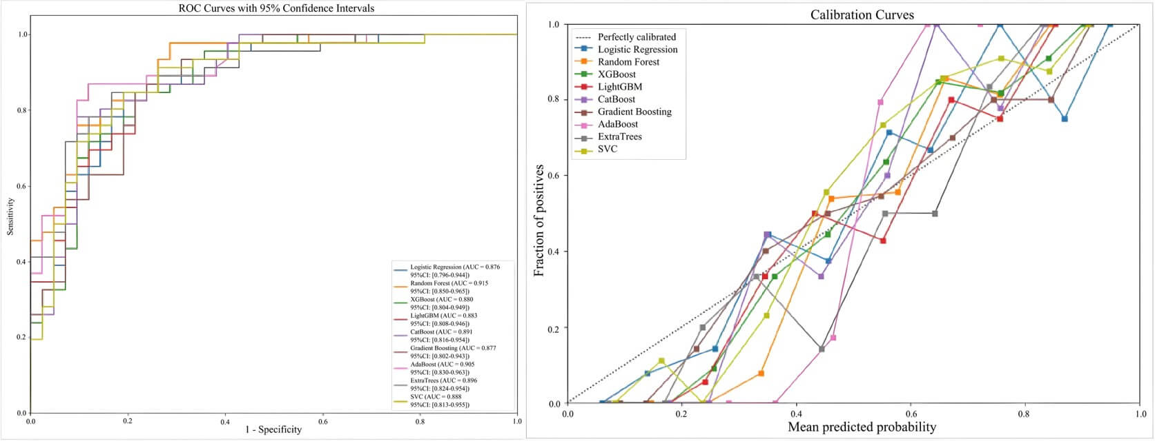 | AdaBoost | 0.905 (0.830–0.963) | 0.851 | 0.870 | 0.810 | 0.851 | 0.917 | 0.826 | 0.636 |