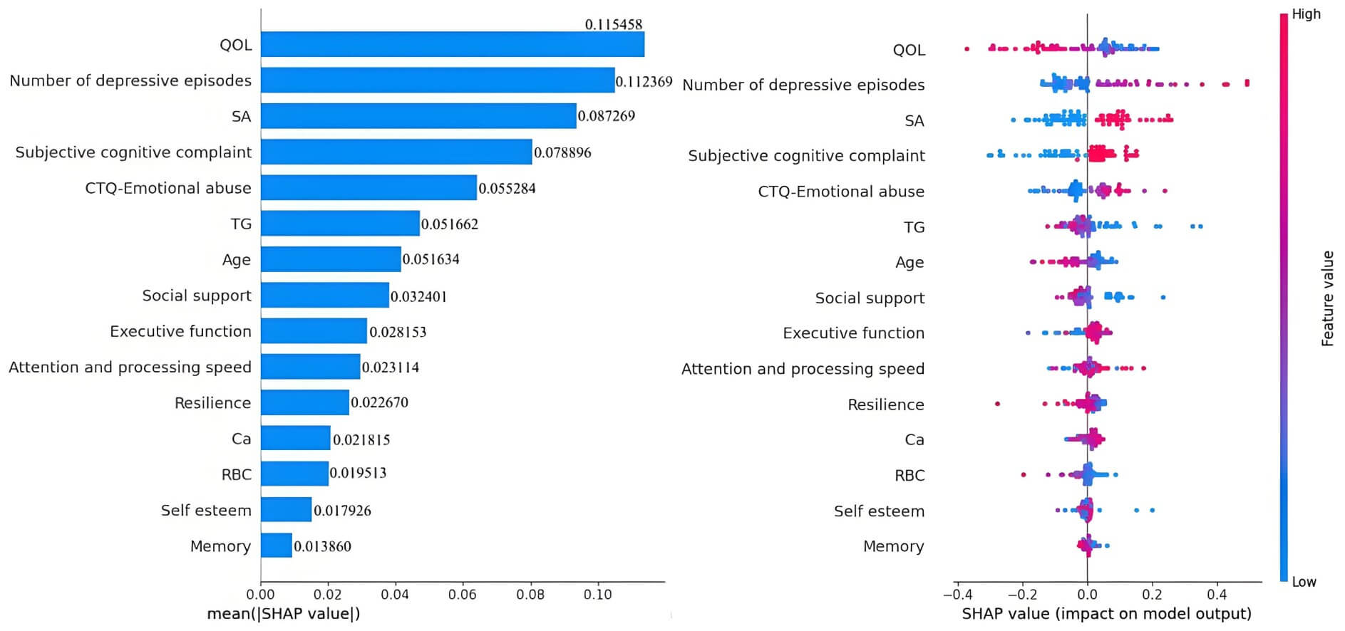 The feature importance analysis of the RF model is shown in Fig. 3. QoL was identified as the paramount predictor of SI, followed by the number of depressive episodes, history of SAs, subjective cognitive complaints, emotional abuse from childhood trauma, TG level, age, social support, objective cognitive functioning, resilience, self-esteem, Ca2+ level, and RBC count.