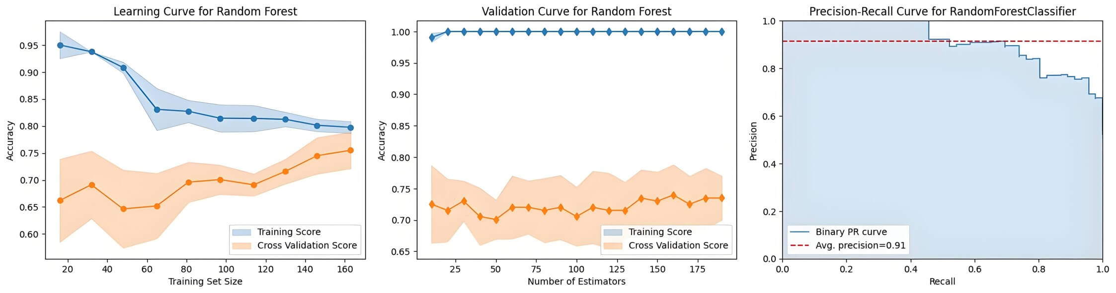 Three evaluation curves revealed the behavioral patterns of the RF model (Fig. 4). The learning curve exhibited progressive convergence between training