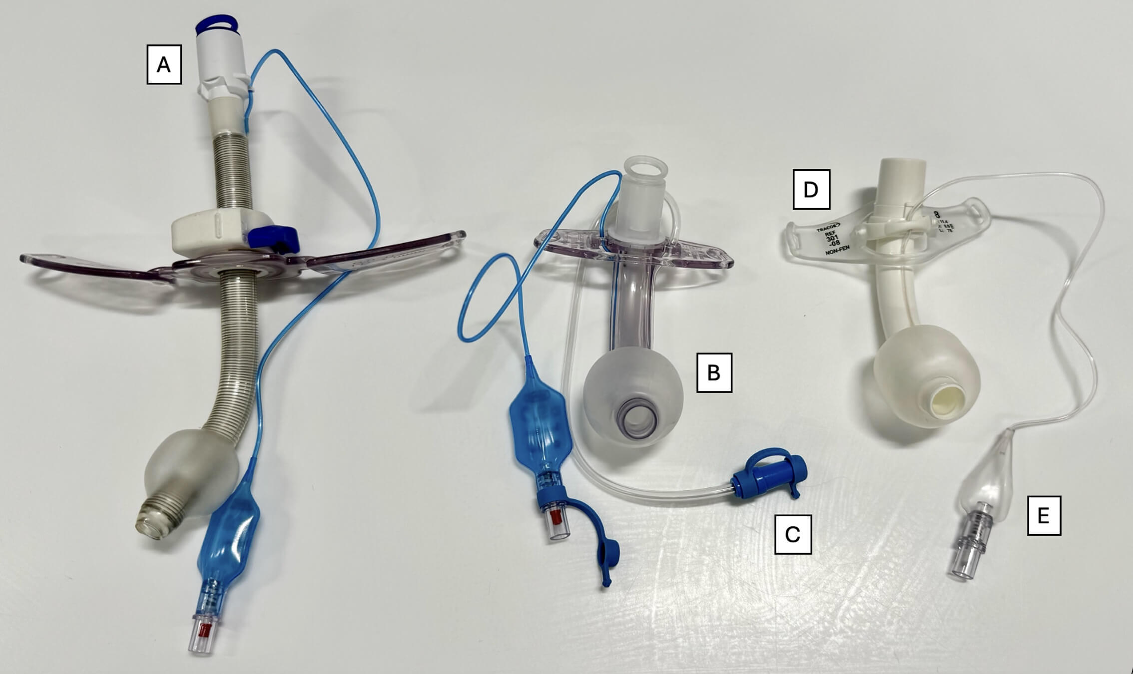 Comparing the difference in appearance between three tracheostomy tubes. Legend: A Portex tracheostomy with adjustable phalange (left), a Portex tracheostomy with non-adjustable phalange (middle) and a Trachoe Twist (right). Other components include the 15 mm connector (A), inflated cuff (B), the subglottic suction port (C), flange (D) and pilot balloon (E). Photo taken by author.