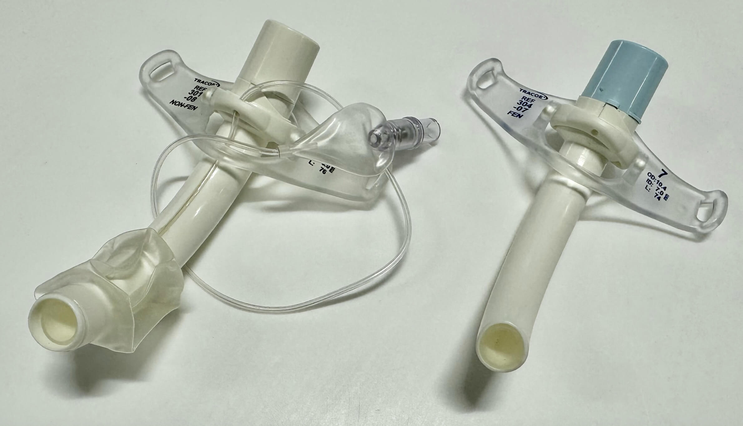 Comparing the difference between a cuffed and non-cuffed tracheostomy tube. Legend: An image showing a cuffed tracheostomy tube with the balloon deflated (left) and an uncuffed tracheostomy tube (right). Note also that both have an inner cannula in situ. Photo taken by author.