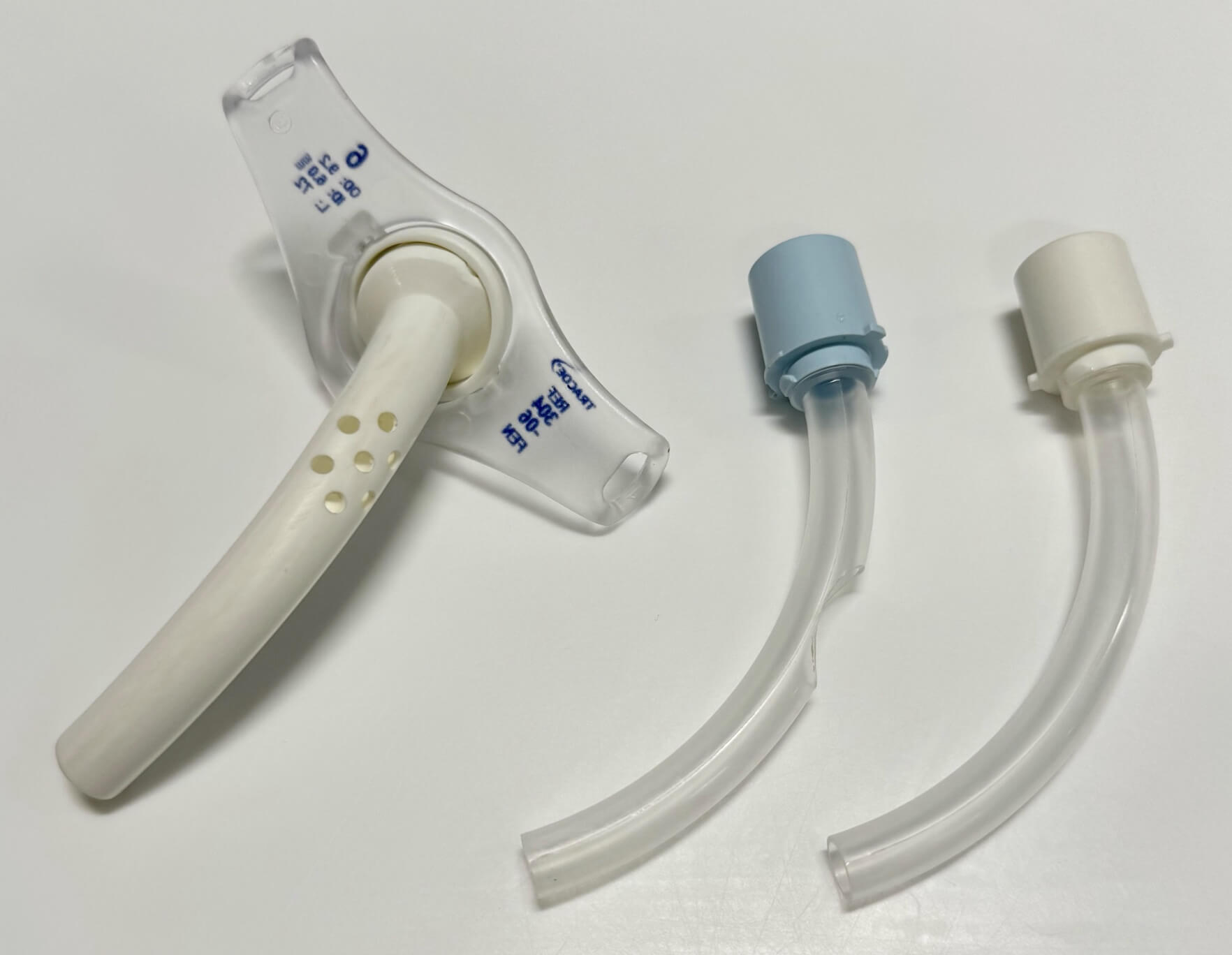 Components of a fenestrated tracheostomy cannula. Legend: An image showing a fenestrated tracheostomy (left), a fenestrated inner cannula (middle) and an unfenestrated inner cannula (right). It is imperative to note that some tracheostomy tubes must have the inner cannula in situ to enable them (and their 15 mm connector) to attach to the associated ventilator/bag-valve-mask. Photo taken by author.