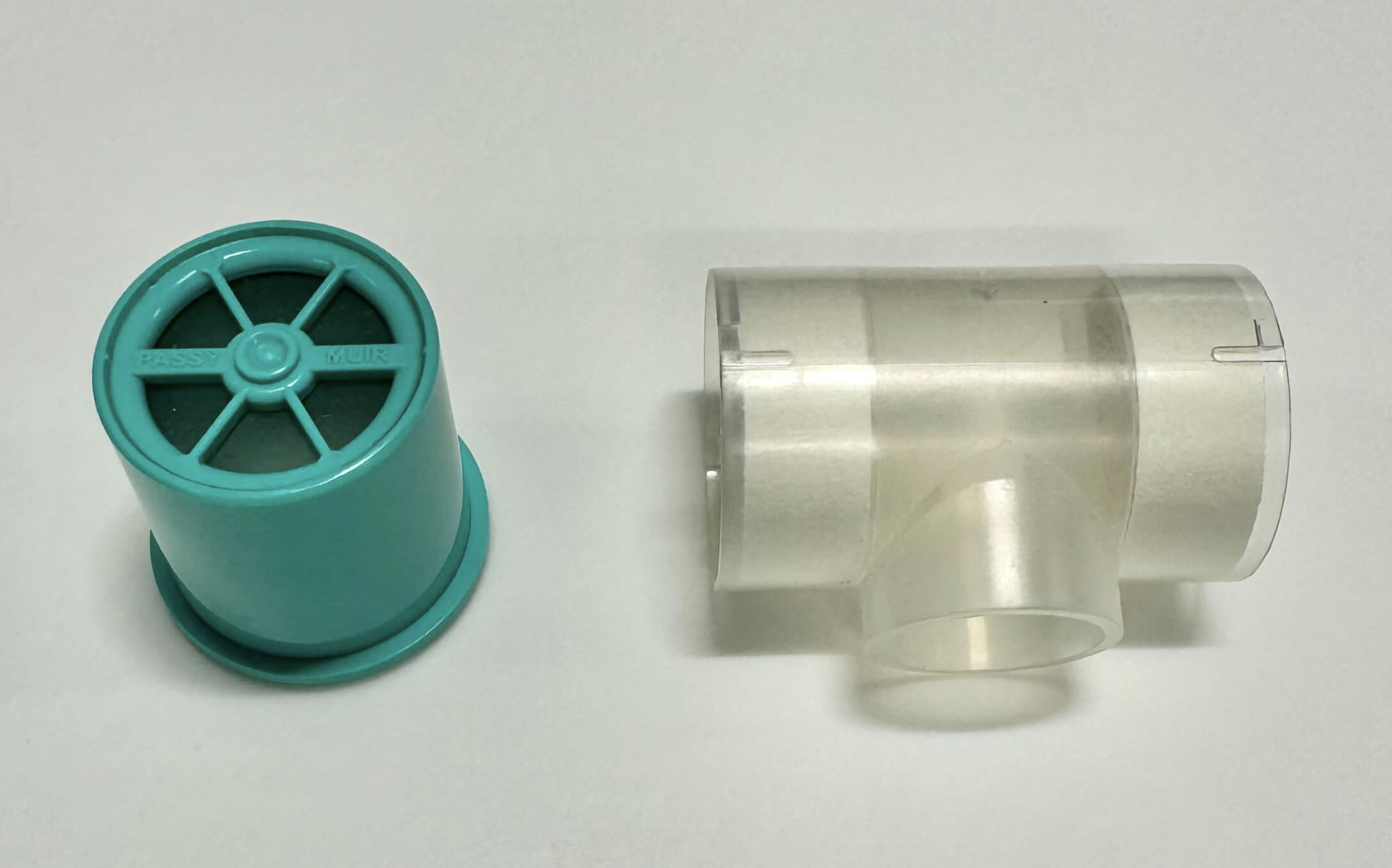 Comparing additional components of a tracheostomy tube. Legend: An image depicting a Passy-Muir Valve (left) and a Swedish nose (right). Photo taken by author.