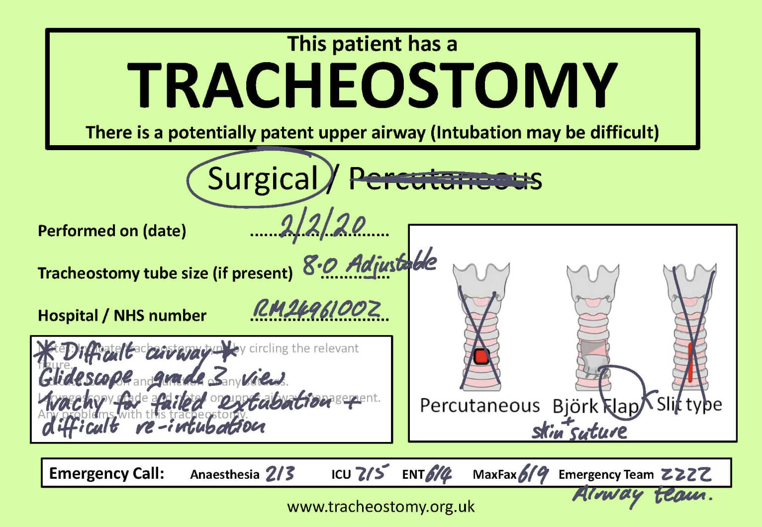 This is the most common complication encountered related to tracheostomies, one that all members of the clinical team should be most familiar with. That said, help is at hand, for details of a patient’s tracheostomy should always be located either above or around their bedspace in the form of a green sign (Fig. 7) [10]. This will include the insertion date, tracheostomy brand, size and insertion method.