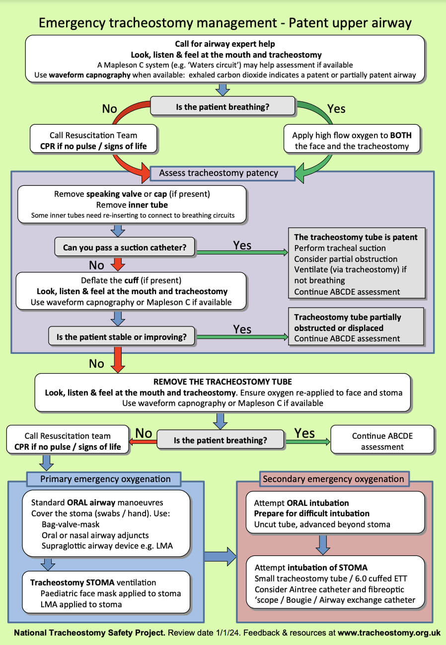 The National Tracheostomy Safety Project tracheostomy algorithm. Legend: The green algorithm is used for emergency tracheostomy management in a patient with a patent upper airway. Reproduced with permission from the National Tracheostomy Safety Project (https://www.tracheostomy.org.uk). CPR, cardiopulmonary resuscitation; LMA, laryngeal mask airway; ETT, endotracheal tube.