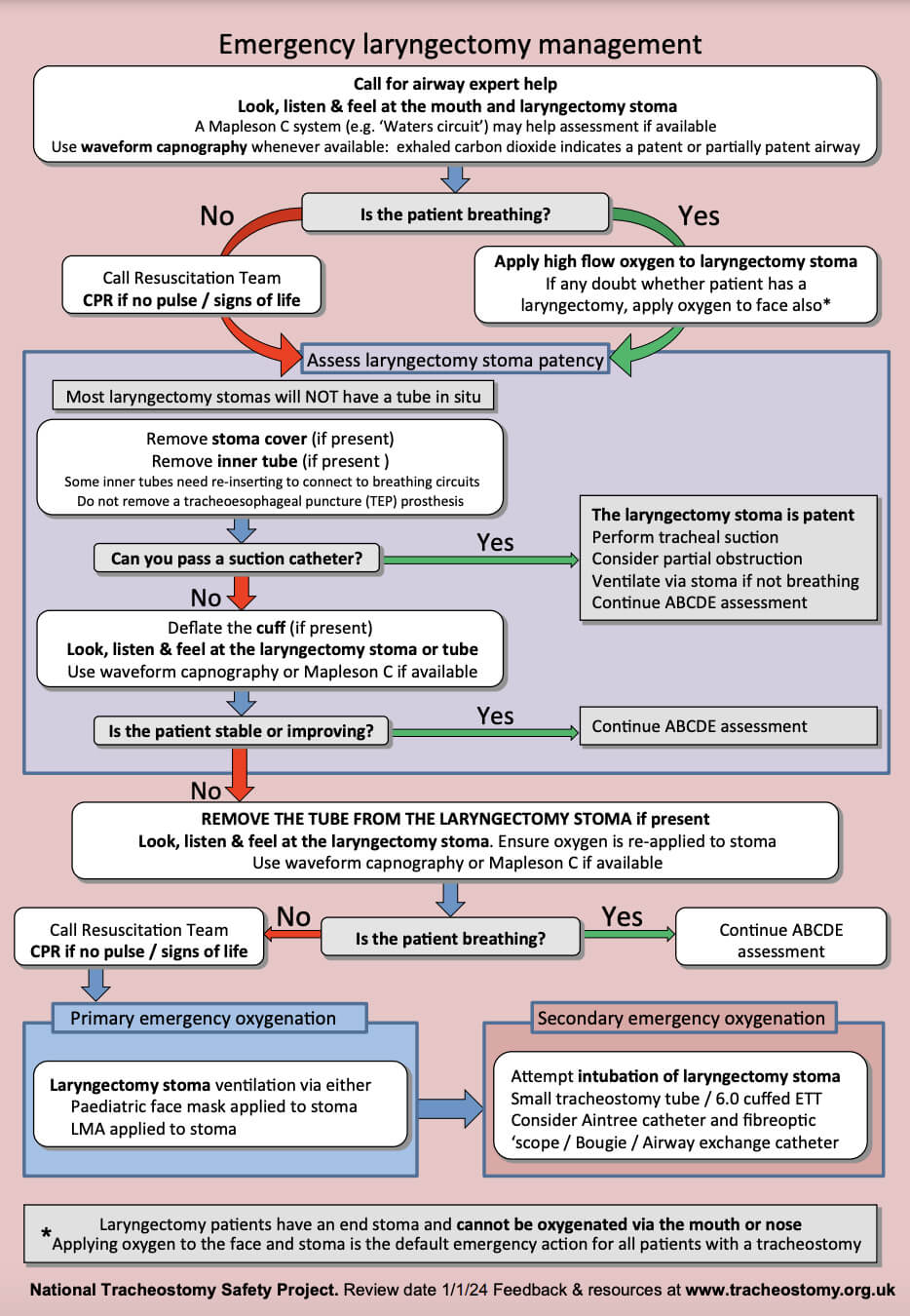 The National Tracheostomy Safety Project laryngectomy algorithm. Legend: The pink algorithm is used for emergency laryngectomy management. As detailed above the salient difference between this and the tracheostomy algorithm is that laryngectomy patients have an end stoma and cannot be oxygenated via the mouth or nose. Reproduced with permission from the National Tracheostomy Safety Project (https://www.tracheostomy.org.uk).