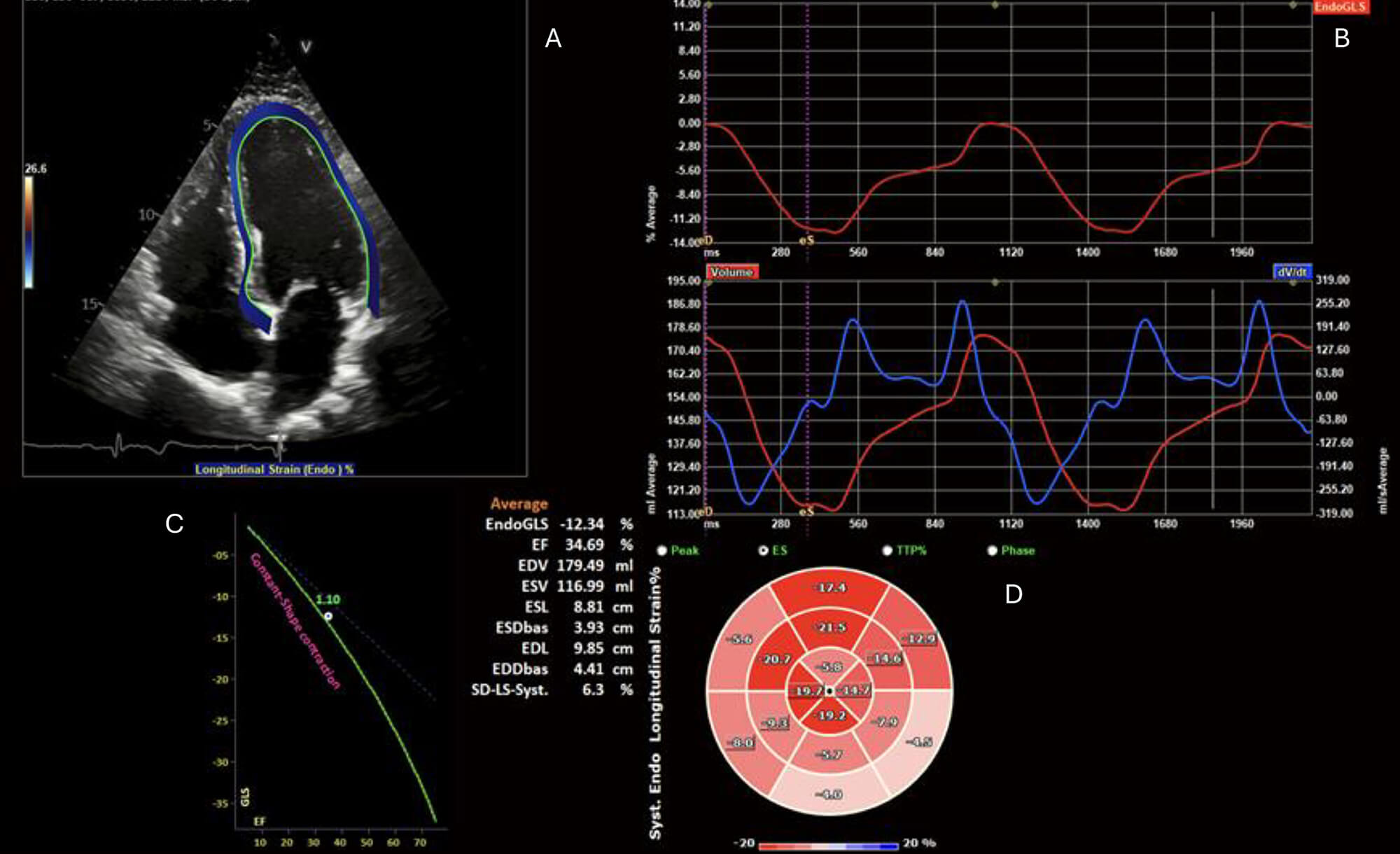 Echocardiogram with endocardial speckle tracking and global longitudinal strain analysis. (A) 2D apical 4-chamber view with endocardial border speckle-tracking. (B) Upper: EndoGLS over time (ms), and lower: LV volume curve (red) and dV/dt (blue) over time (ms). (C) Reference plot for global longitudinal strain (GLS) vs LVEF. (D) 16-segment polar map if segmental EndoGLS demonstrating regional reduction in longitudinal strain, particularly affecting the basal inferior and inferolateral segments. ES, End-Systole; TTP, Time to Peak; EndoGLS, endocardial global longitudinal strain; EF, ejection fraction; EDV, End-Diastolic Volume; ESV, End-Systolic Volume; ESL, End-Systolic Length; ESDbas, End-Systolic Diameter, basal; EDL, End-Diastolic Length; EDDbas, End-Diastolic Diameter, basal; SD-LS-Syst., Standard Deviation of Longitudinal Strain during Systole.