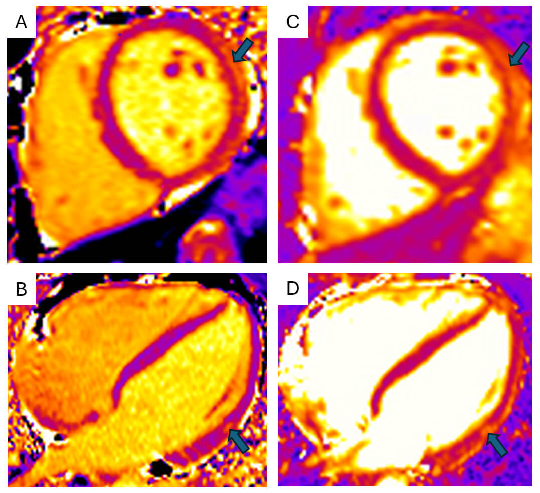 resonance imaging (MRI) T1 (A,B) and T2 (C,D) mapping of the myocardium in mid