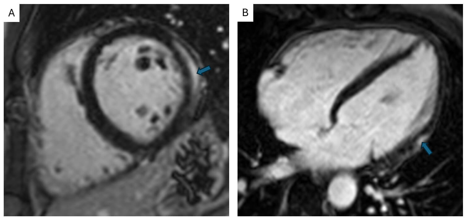 Cardiac magnetic resonance late enhancement imaging. Cardiac MRI mid short-axis (A) and four-chamber (B) images demonstrating post-gadolinium mid to subepicardial enhancement in the lateral wall (arrows). Images acquired on Siemens Aera 1.5T scanner (Siemens, London, England).