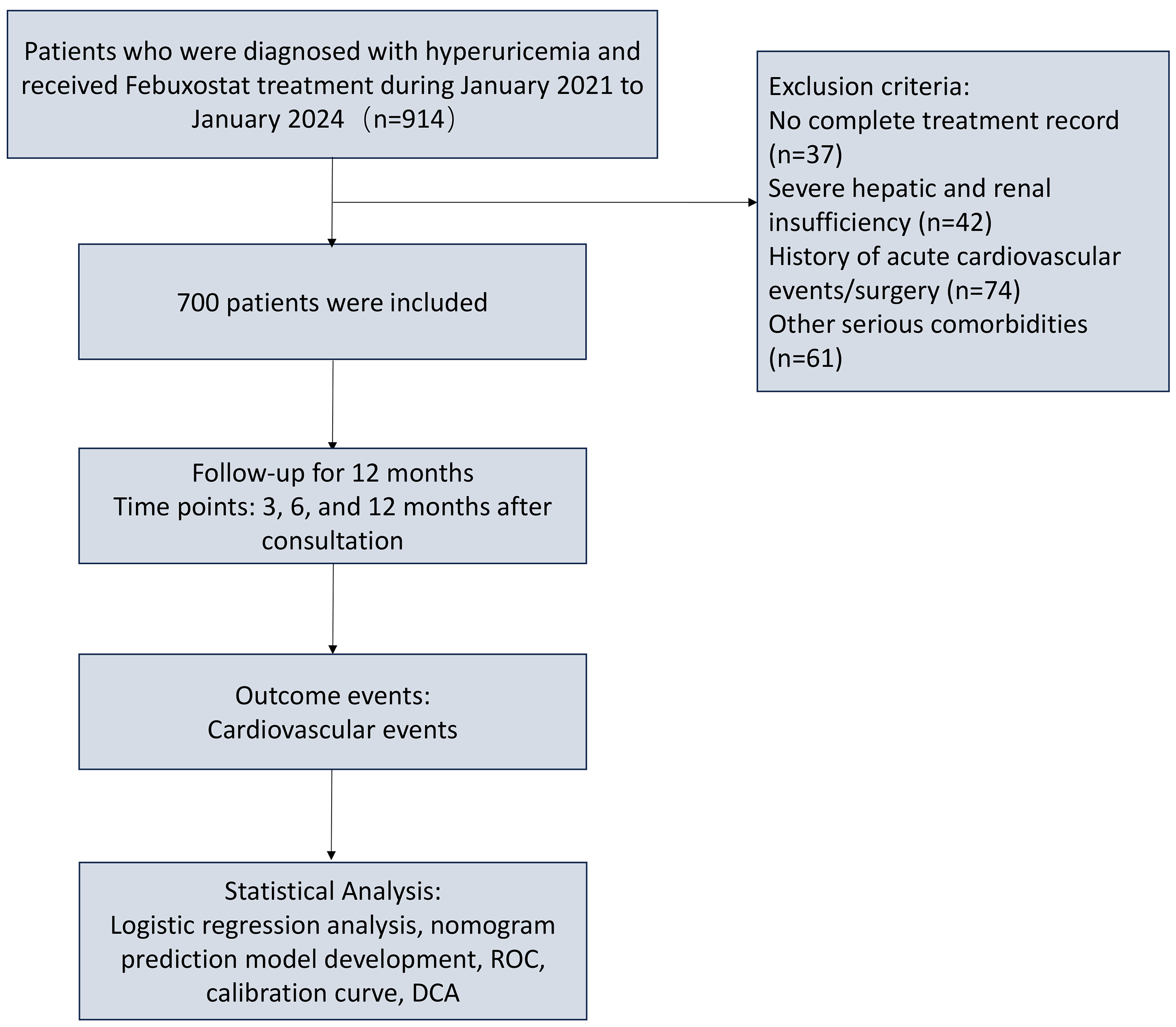 In this study, patients with hyperuricemia who attended Quzhou Municipal People’s Hospital and received febuxostat therapy were enrolled as the study population. A 12-month follow-up period was conducted after treatment initiation to assess the occurrence of cardiovascular events. Potential risk factors were systematically evaluated using statistical modeling, and a cardiovascular event prediction model was constructed to provide evidence-based reference for clinical decision-making and facilitate early identification and intervention in high-risk patients.